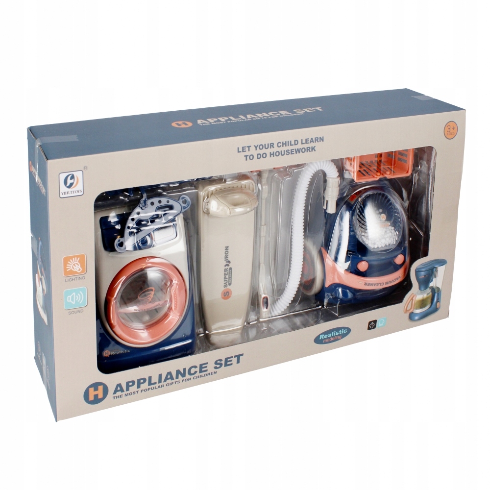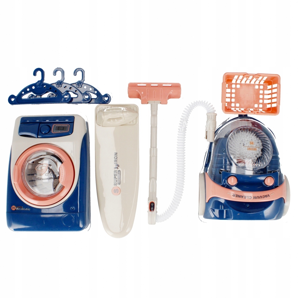 Стиральная машина имеет звуковые и световые эффекты, имеет открывающуюся дверцу барабана и выдвижной ящик для порошка, барабан стиральной машины вращается при включении, их можно вынимать после стирки, пылесос имеет звук и свет. Эффект: после включения пылесоса шарики пенопласта, помещенные в резервуар, вращаются, имитируя процесс уборки пылесосом.