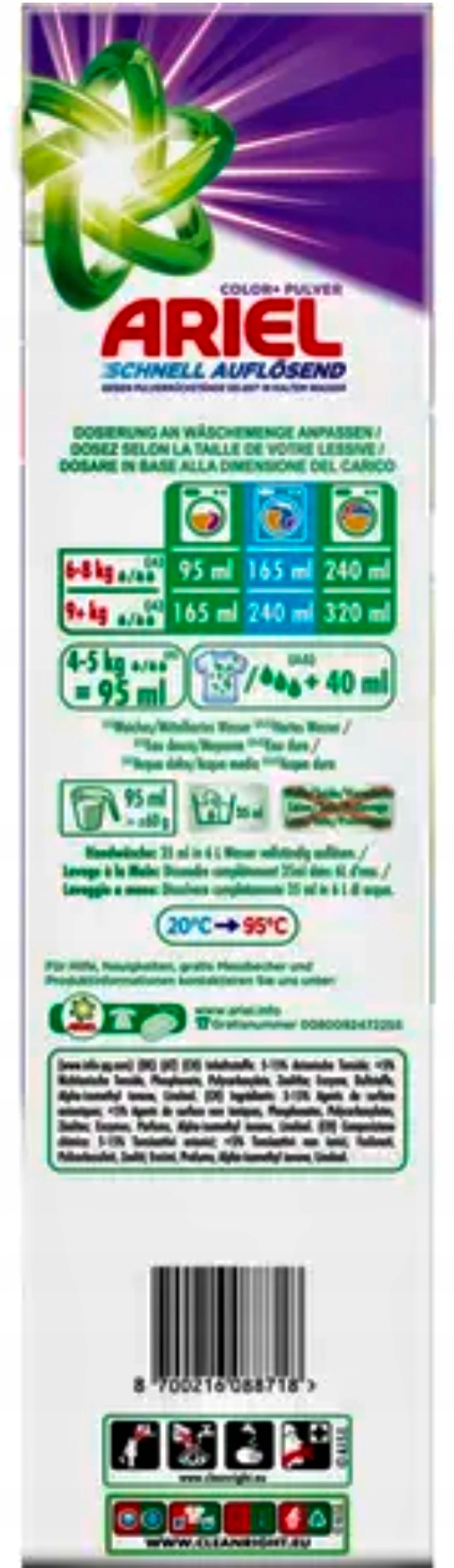 Смывальный порошок Ariel Color поддерживает сияющую чистоту даже при более низких температурах, сохраняя при этом яркие цвета. Инновационная формула быстро растворяется в контакте с водой, немедленно активирует и глубоко проникает в волокна, обеспечивая превосходные результаты промывки, сохраняя цвет цвета даже при более низких температурах. Смывальный порошок цветов Ariel удаляет постоянные пятна - даже те, которые вызывают неприятные запахи, такие как пот и запах тела. Он имеет уникальную технологию, которая предотвращает остаток порошка. Уменьшите температуру промывки до 30 ° C и сэкономьте до 60% энергии. (Потребление энергии через стиральную машину, от 60 ° C до 30 ° C, нормальный цикл прачечной). и защита от цвета : стиральный порошок ариэля гигиенически очищает, а также защищает цвета (в отличие от ярко -чистого порошка Ariel)