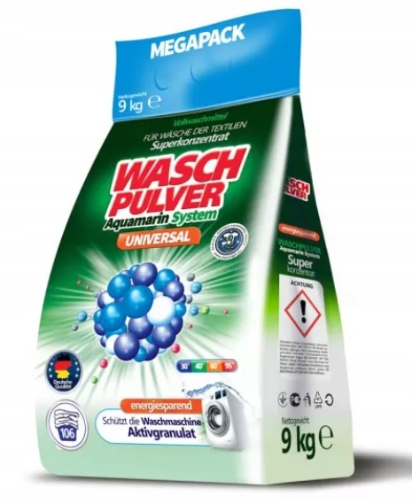 Порошок WaschPulver 9кг Аквамарин универсальная фольга – превосходный качественный, эффективный немецкий стиральный порошок вместимостью до 9кг. Очень эффективен, хватает на 106 стирок! Обладает интенсивным ароматом и очень хорошо растворяется в воде, удаляя даже самые сильные пятна и восстанавливая цвет одежды.
