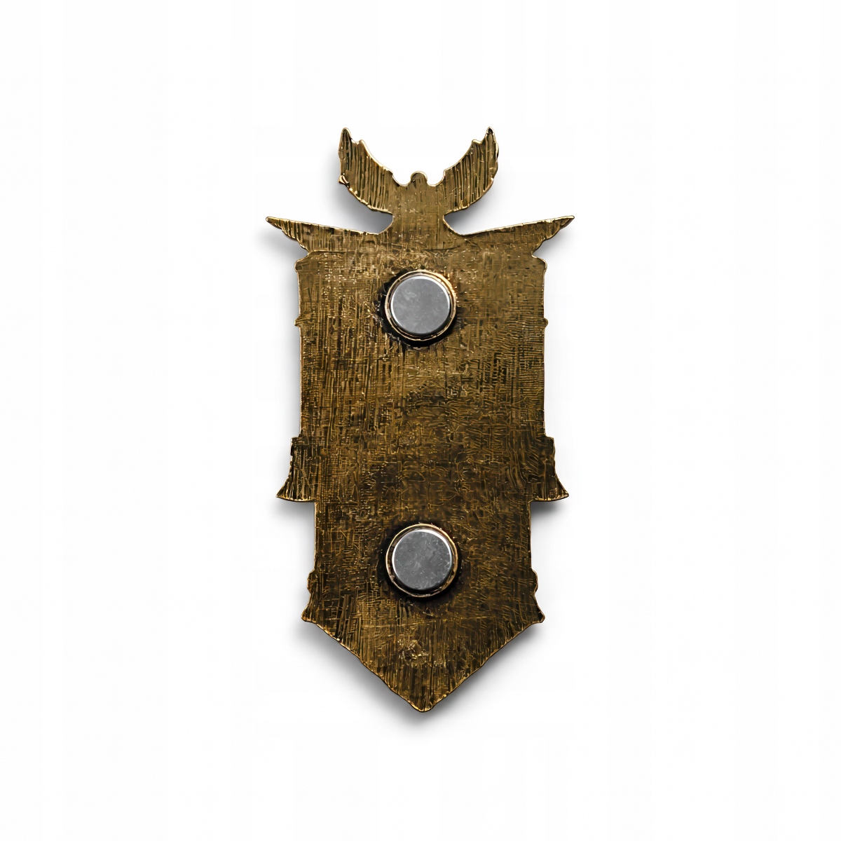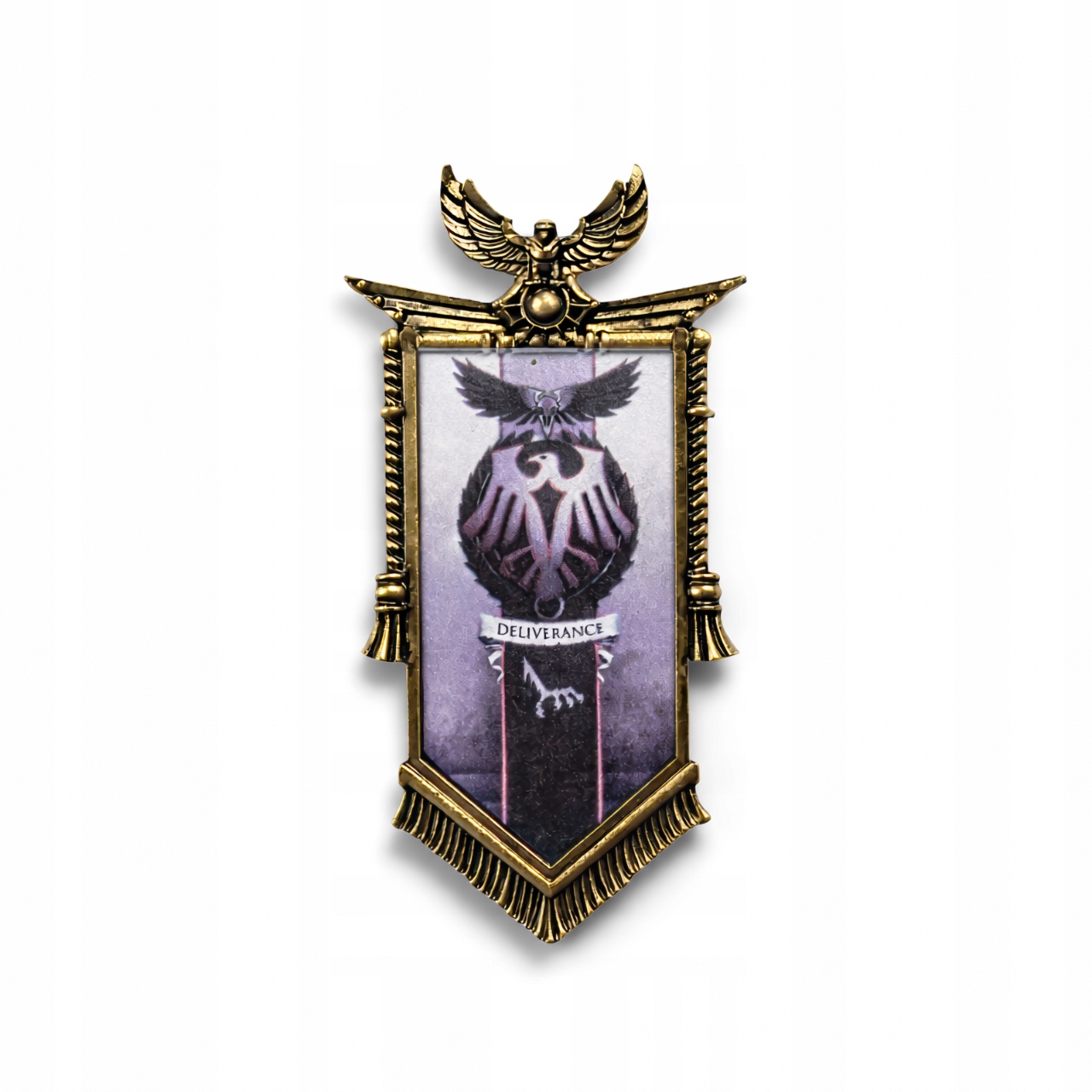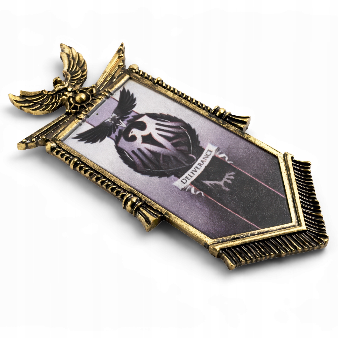 С темных небес Освобождения Гвардия Ворона наносит удар без предупреждения, и знамя Гвардии Ворона приносит то же чувство скрытности и развязности прямо в ваше пространство в действительно наглядной форме. Это металлический магнит высотой 22 см, похожий на миниатюрный баннер главы: высокий, жирный и легко читаемый для любого поклонника суровой эстетики Warhammer 40k. Все это имеет теплый оттенок старинного золота, а рамка полна резких рельефных деталей: вверху расположен крылатый гребешок, по краям видна витая «веревочная» текстура, по бокам — тонкие акценты с бахромой, а нижняя часть заканчивается рифленой полосой с «кисточками», напоминающей церемониальную отделку. В центре находится фиолетовая баннерная панель с черным символом Гвардии Ворона, а слова «ИЗБАВЛЕНИЕ» на ленте сразу напоминают о корнях и наследии ордена. С обратной стороны пластины встроены два круглых магнита, поэтому она надежно удерживается на холодильнике, металлическом шкафу или другой стальной поверхности. Твердый металл придает приятный вес и ощущение «премиумности» — идеально подходит для уголка для хобби, стола для рисования или стены для коллекции.
