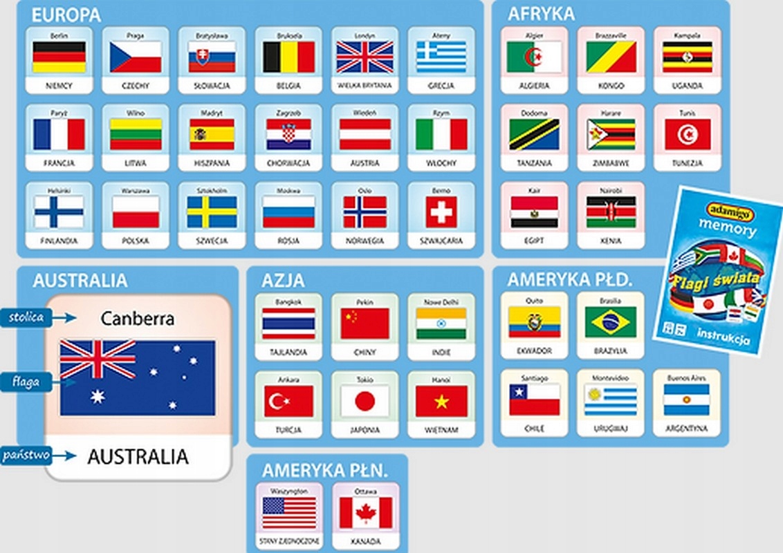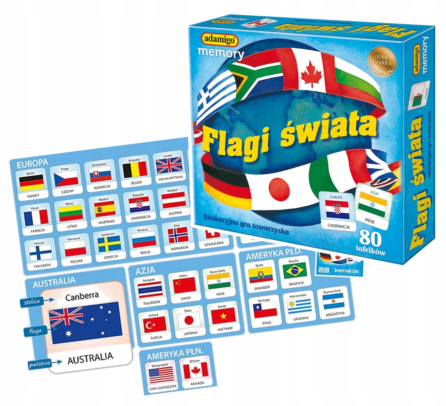 Игра «Память Adamigo» - отличная социальная игра для всех, кто любит веселиться в веселом климате. Он разрабатывает память, учит концентрации, приближает свою семью и делает свое свободное время более приятным. На этот раз молодой игрок имеет возможность познакомиться с появлением целых 40 флагов разных стран со всего мира.