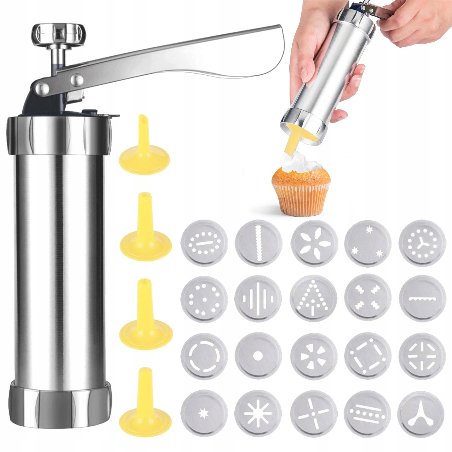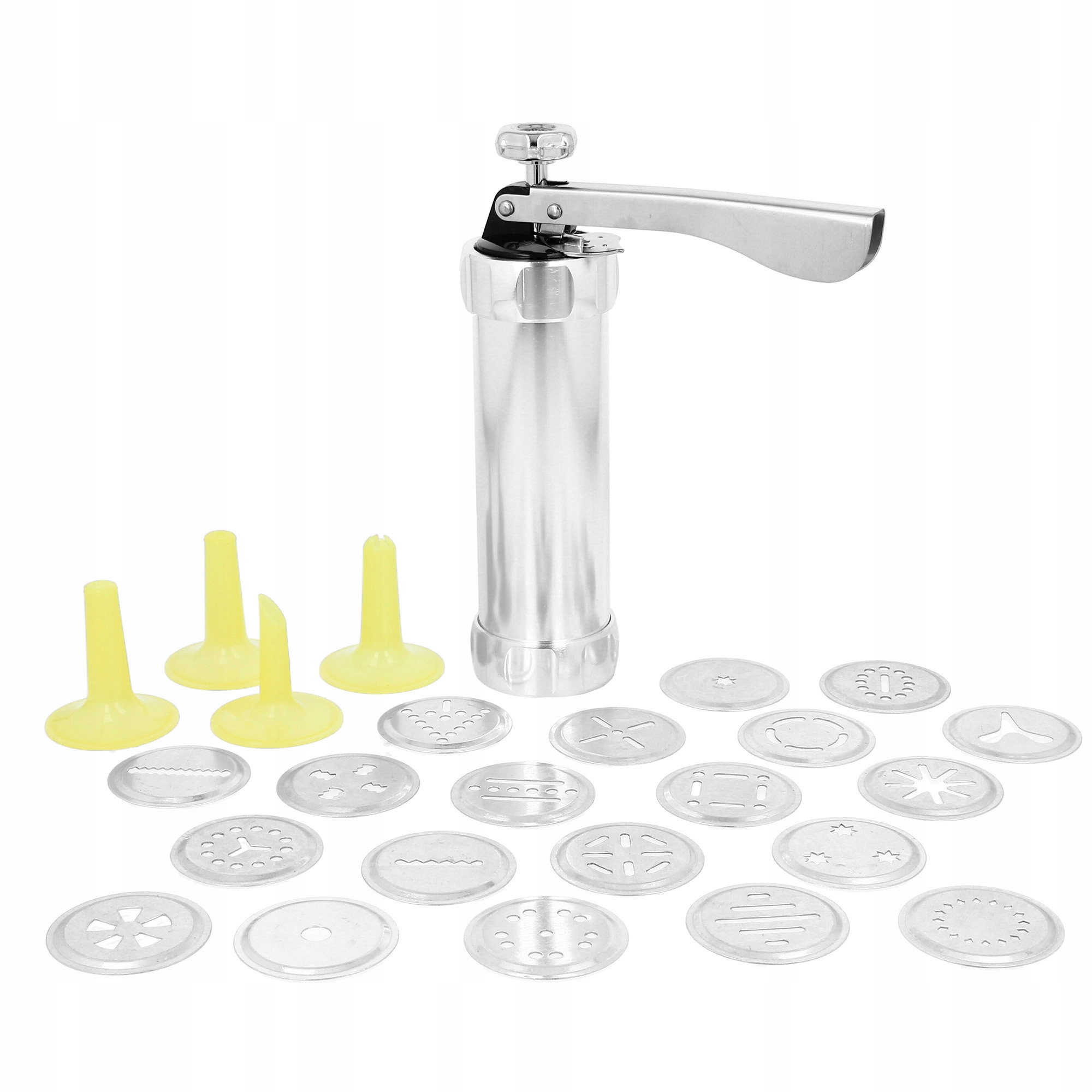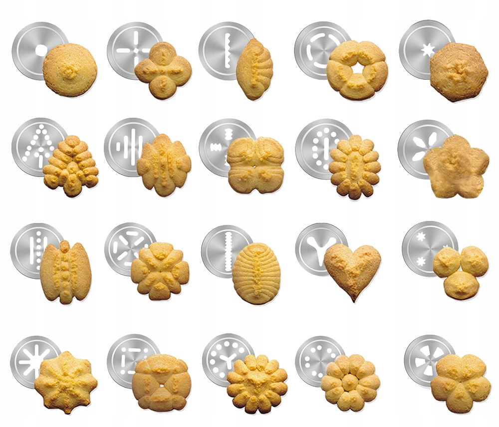 - В комплект входит 20 дисков для изготовления печенья и 4 насадки для украшения.