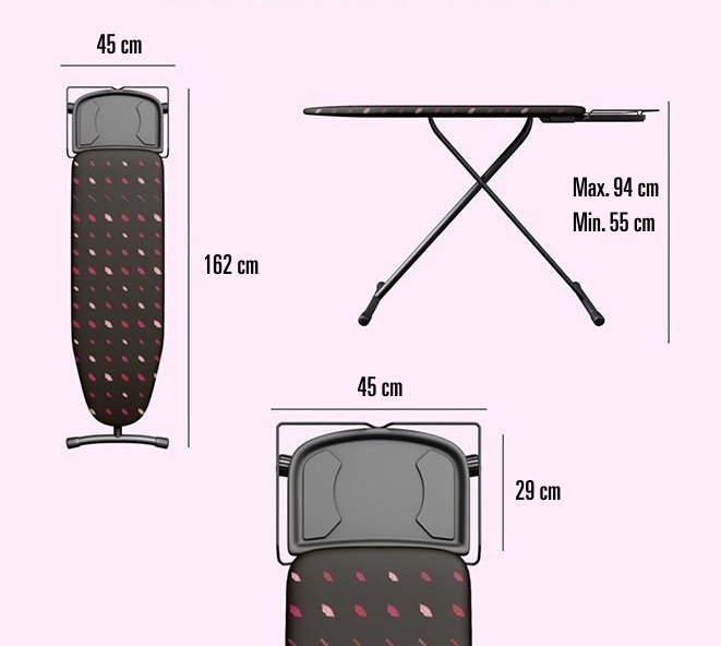 - Размеры сложенной доски со сложенным железным основанием: 162 х 45 х 8,5 см.