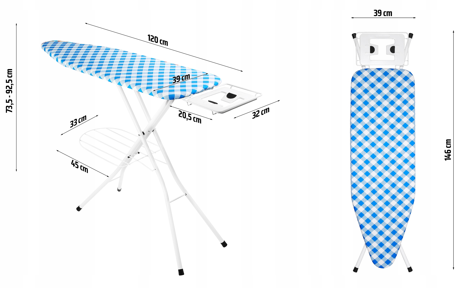 - Размеры доски в разложенном виде: 146 x 39 x 92,5 см.