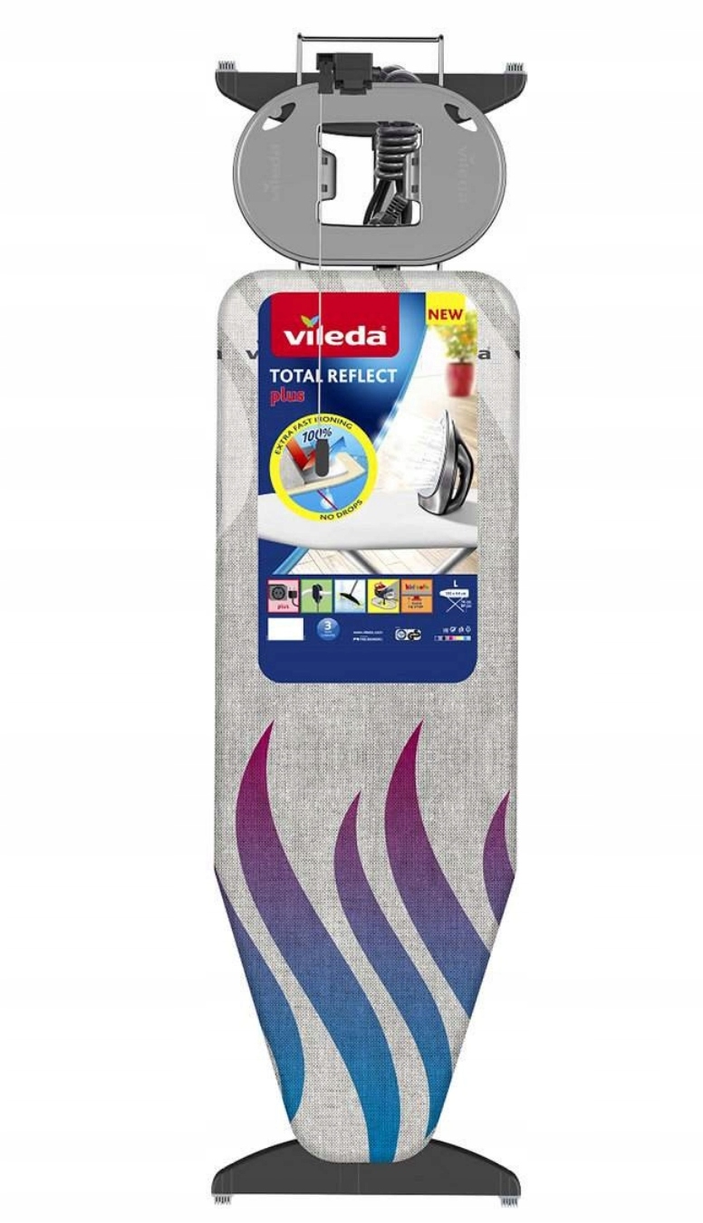 VILEDA Total Reflect Plus — усовершенствованная гладильная доска, сочетающая в себе функциональность с инновационными решениями, обеспечивающими максимальный комфорт при глажке. Благодаря уникальным функциям, таким как слой, отражающий пар, или антенна, поддерживающая кабель, глажка становится быстрее и проще.