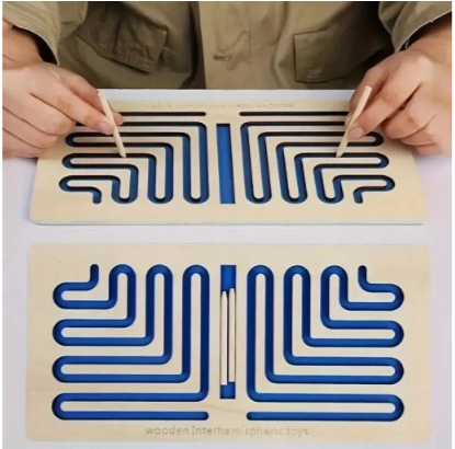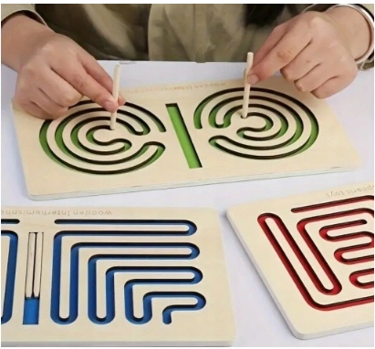 Развивает и поддерживает моторные навыки ручной работы, координацию глаз. Каждая из досок отличается, каждая имеет две деревянные палочки, которые вам нужно преодолеть лабиринт правой и левой рукой одновременно, что является проблемой для детей.