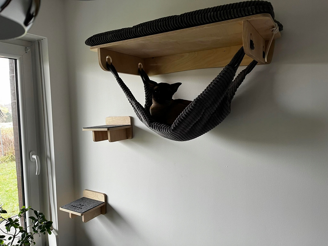 Надежная конструкция — полка выдерживает нагрузку даже более крупных кошек, а отшлифованная вручную фанера обеспечивает долговечность и эстетику.