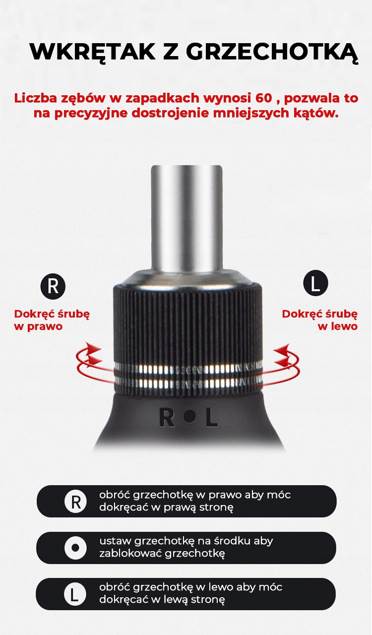 Отвертка с храповым механизмом имеет храповое колесо уменьшенного диаметра 22 мм и количеством зубьев 60, что позволяет производить точную регулировку даже под небольшими углами. . Быстрая настройка в особых условиях работы более эффективна и экономит энергию.