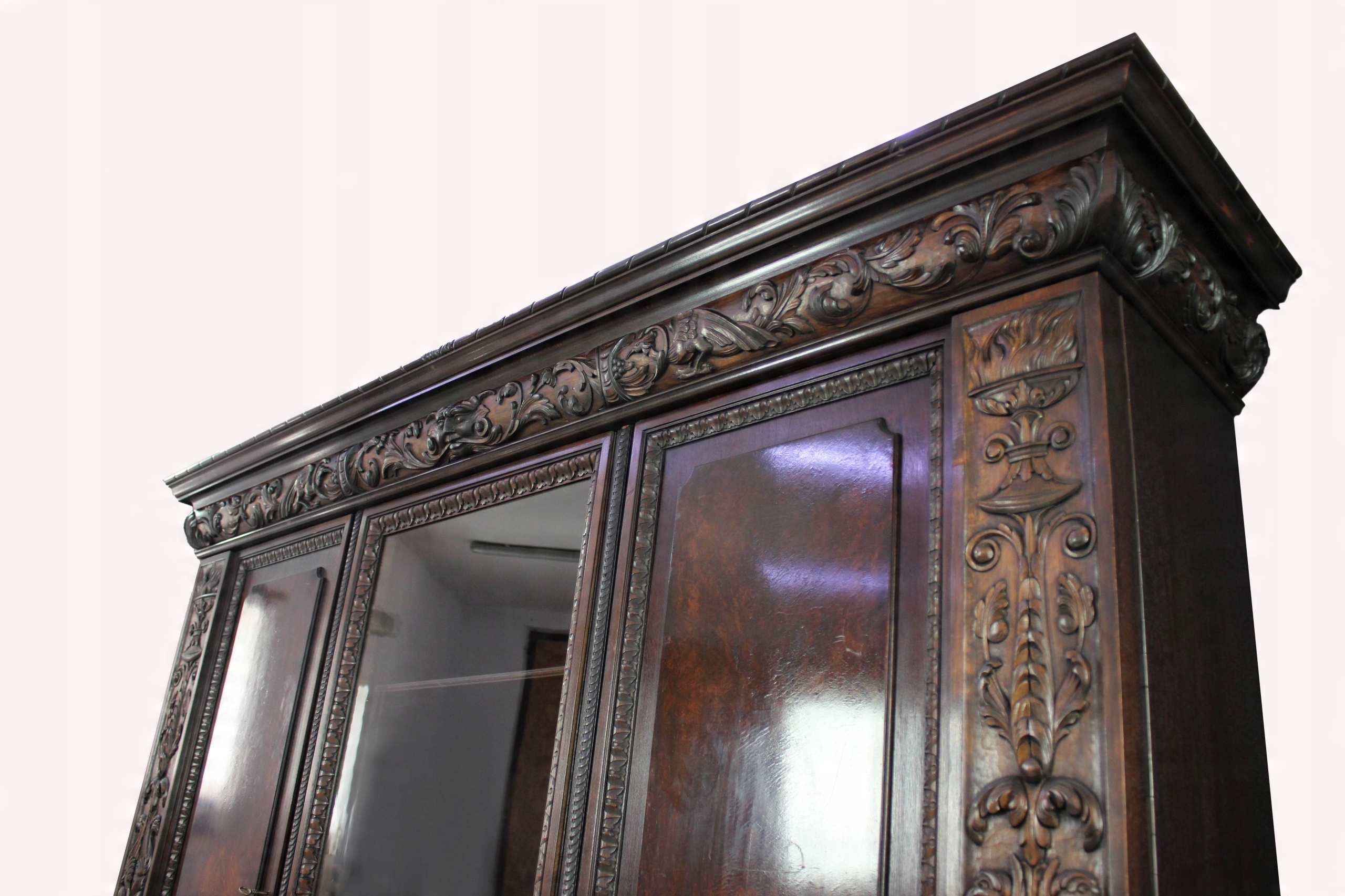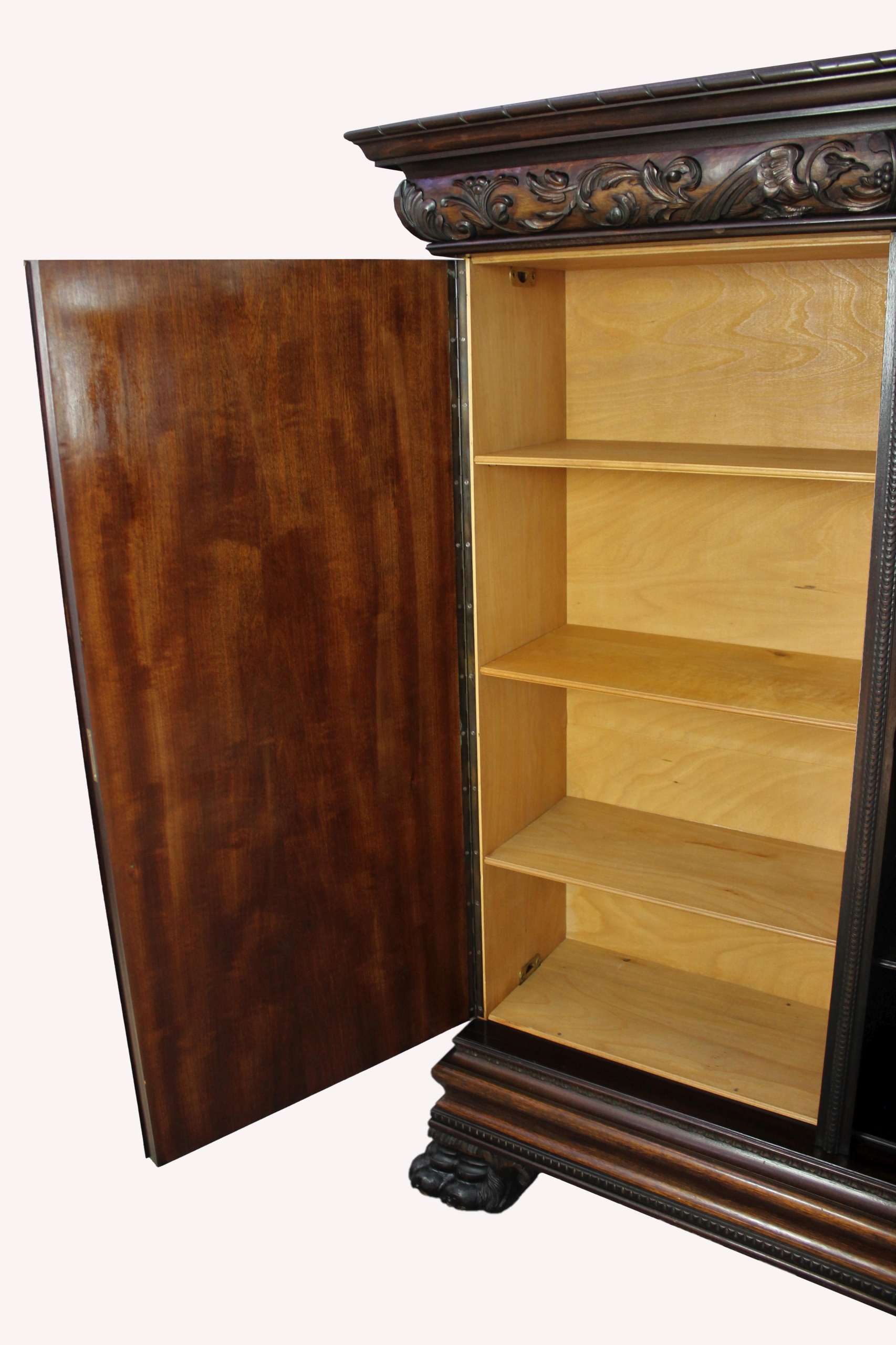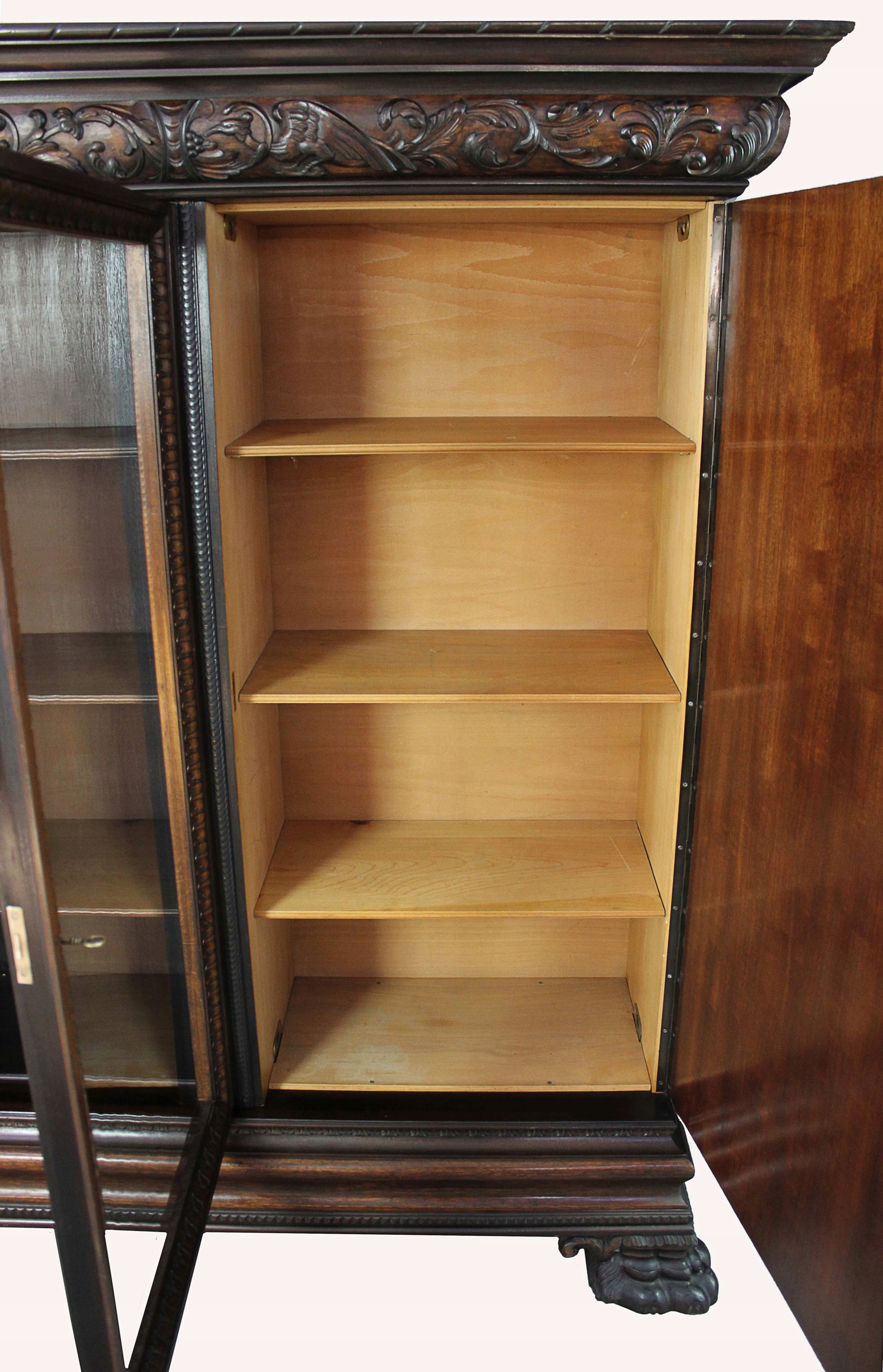 Репрезентативная библиотека уникальной массивной формы, характерной для стиля неоренессанс. В нем проведен консервативный ремонт с сохранением оригинального финишного покрытия. Все очень хорошо подогнано, продезинфицировано, нет неприятных запахов и насекомых. Замки функциональные, к каждому есть ключ. Мебель имеет обычные признаки использования. Состояние очень хорошее, готово к размещению.