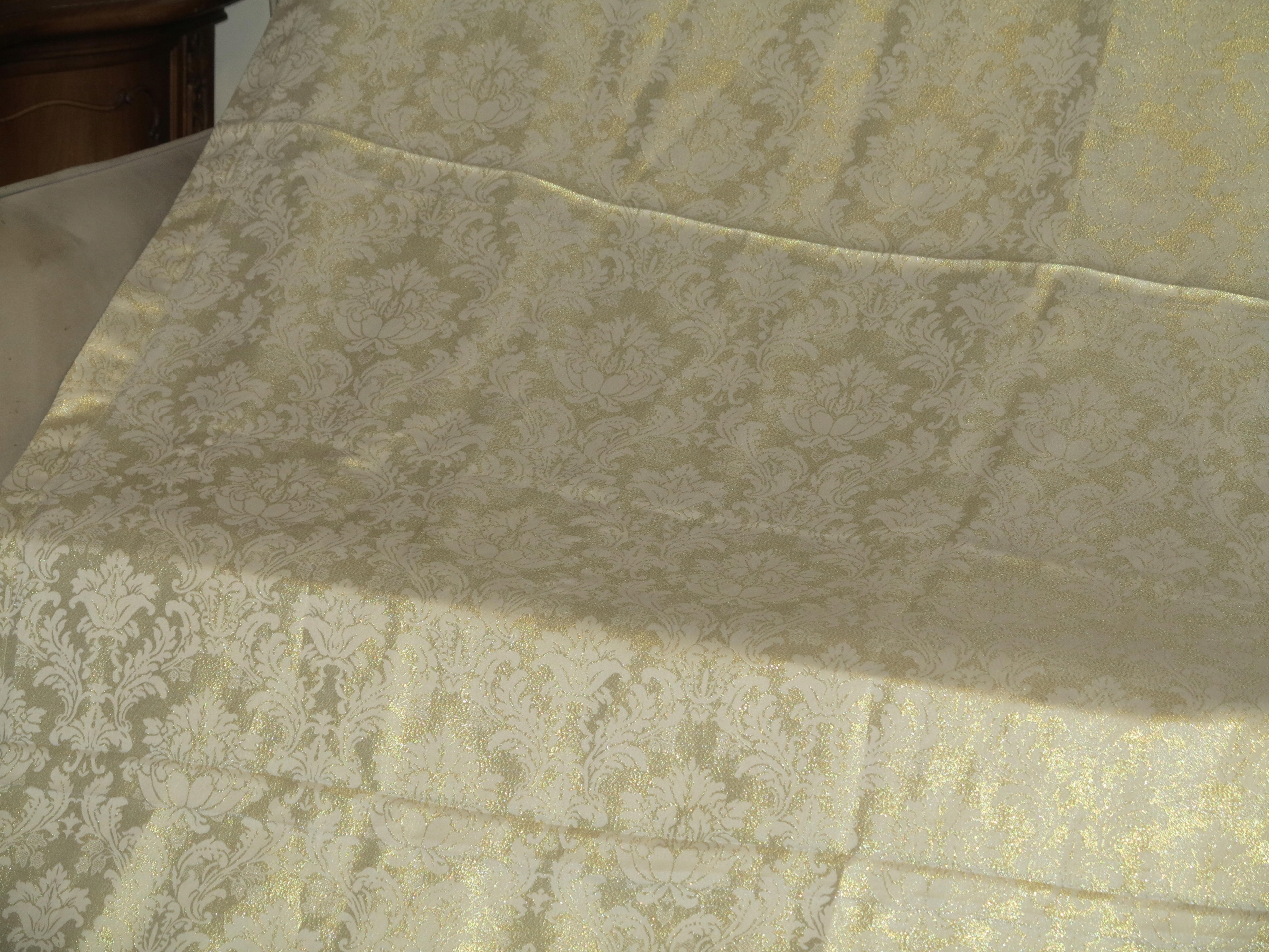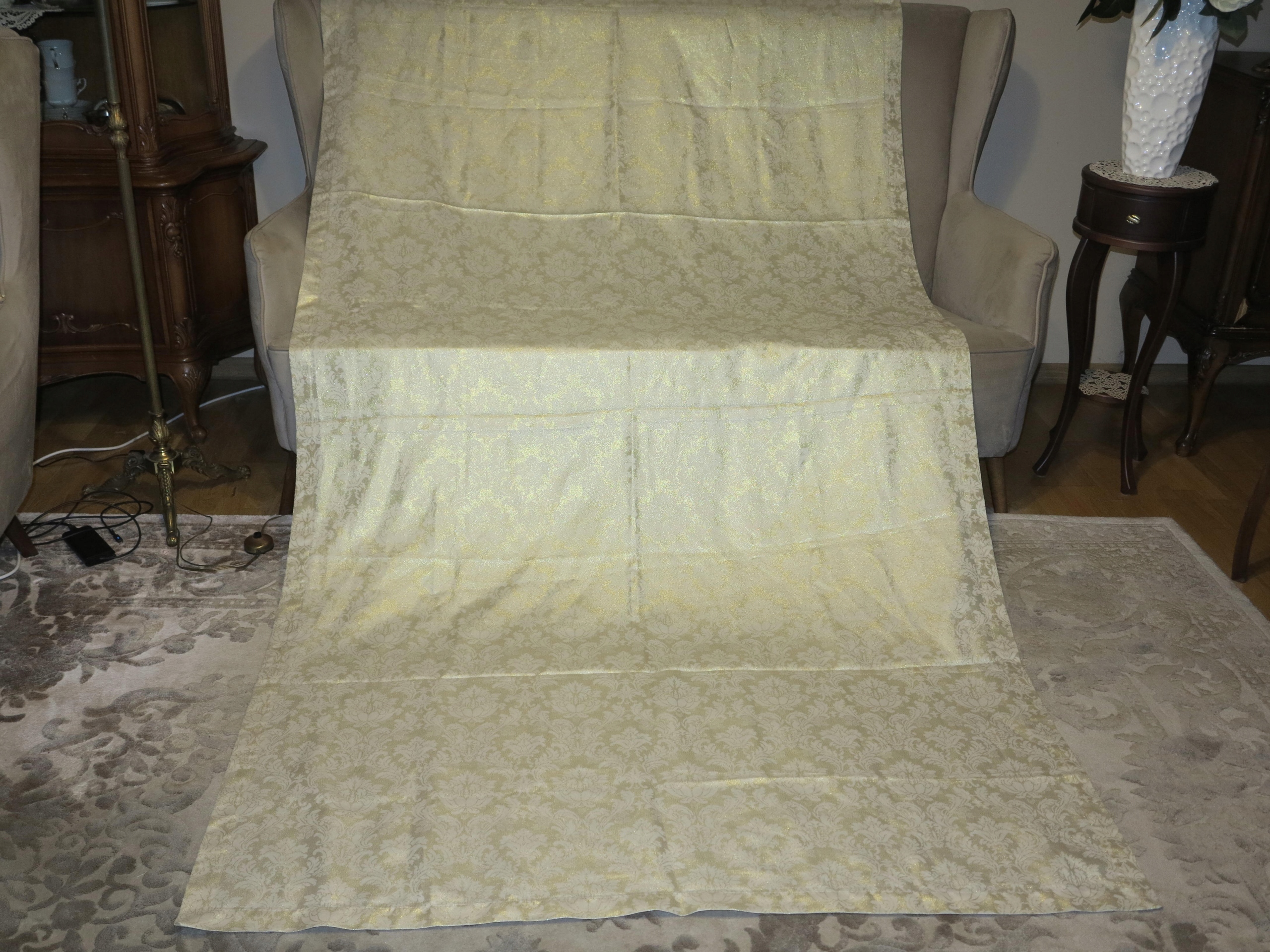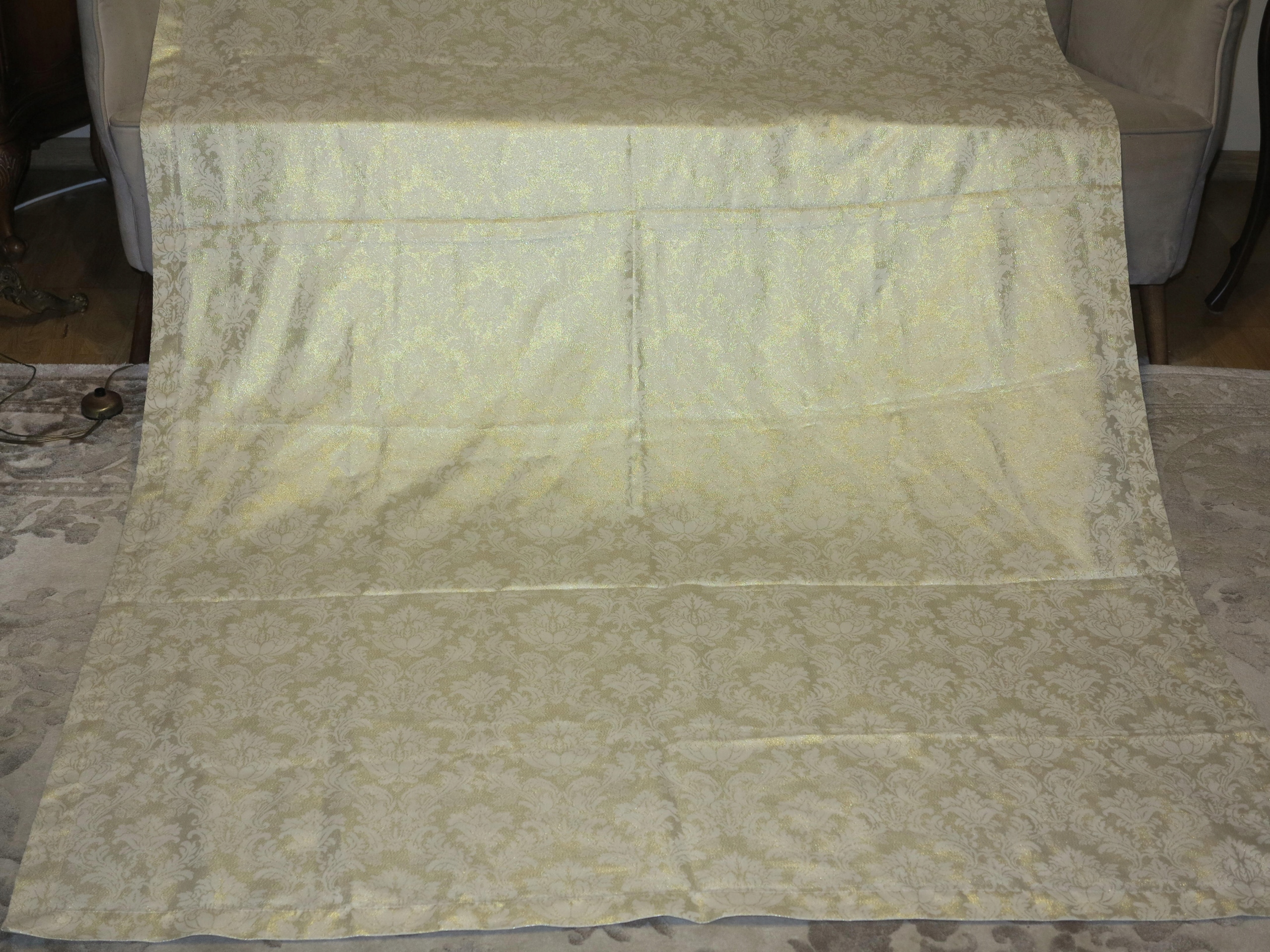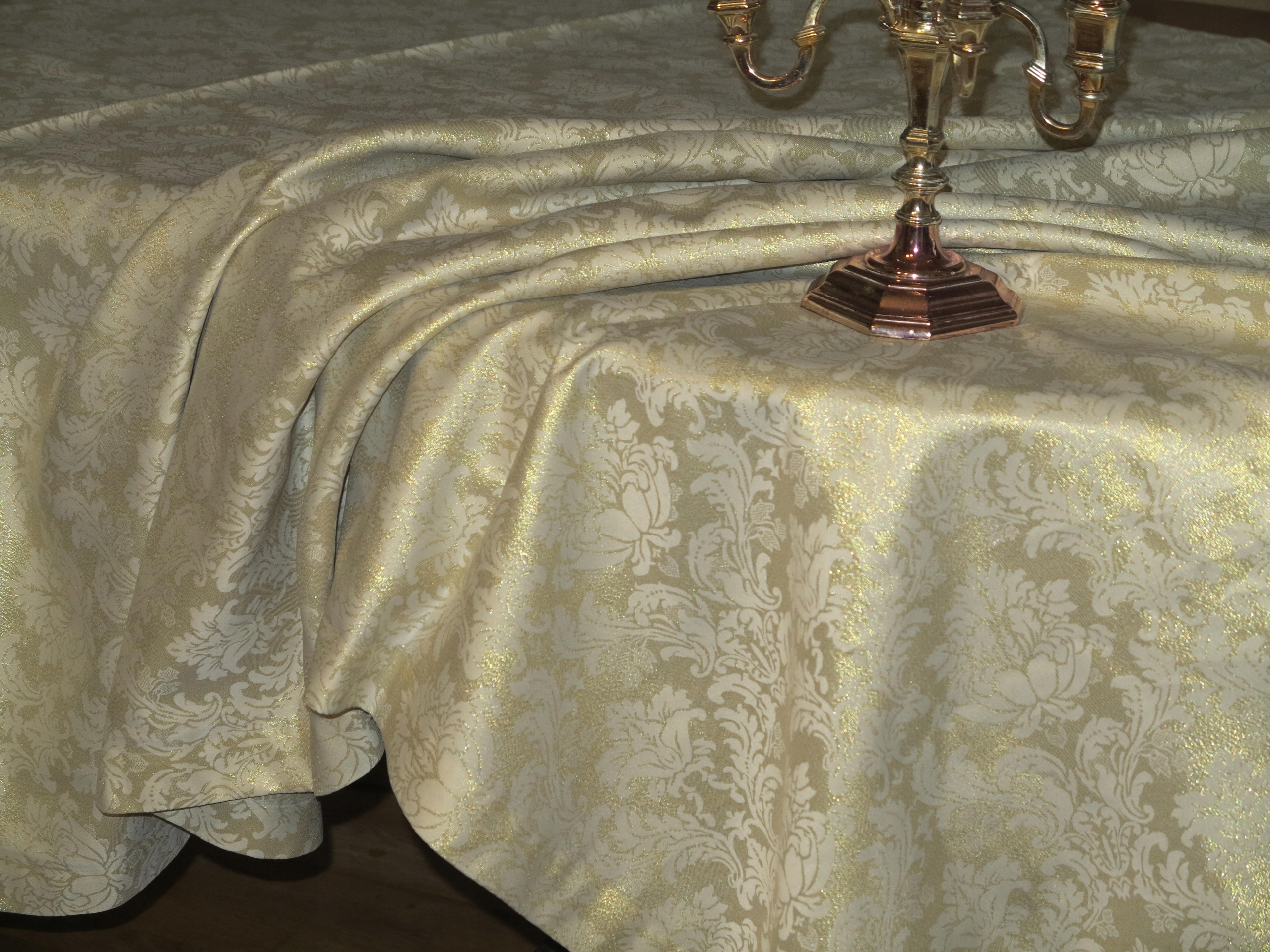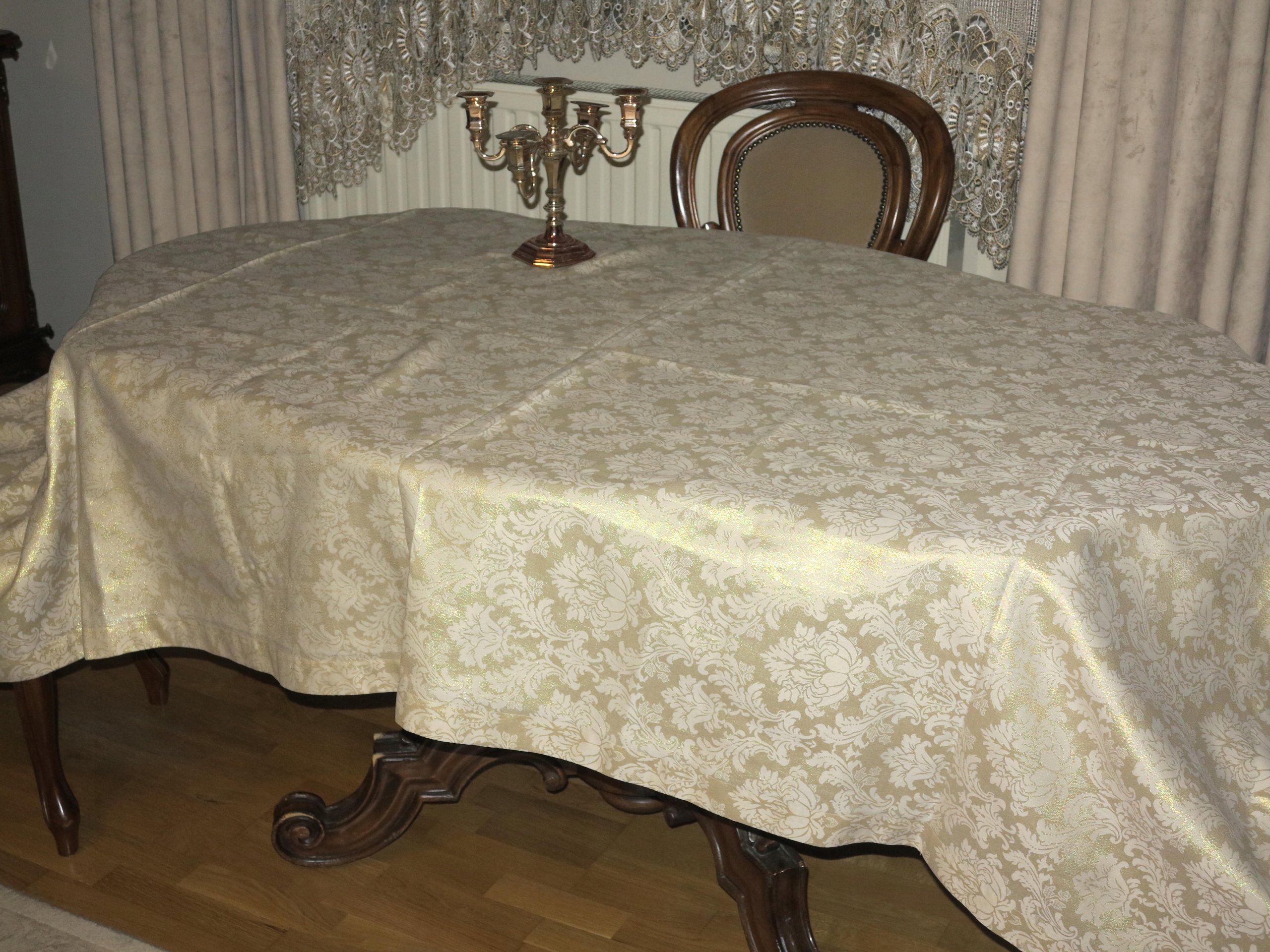 КРАСИВУЮ СКАТЕРТЬ ИЗ ЖАККАРДОВОЙ ТКАНИ С УЗОРОМ КАНТУ, ЦВЕТА ЭКРУ, ДОСТАВКА С МНОГО ЗОЛОТОЙ НИТИ