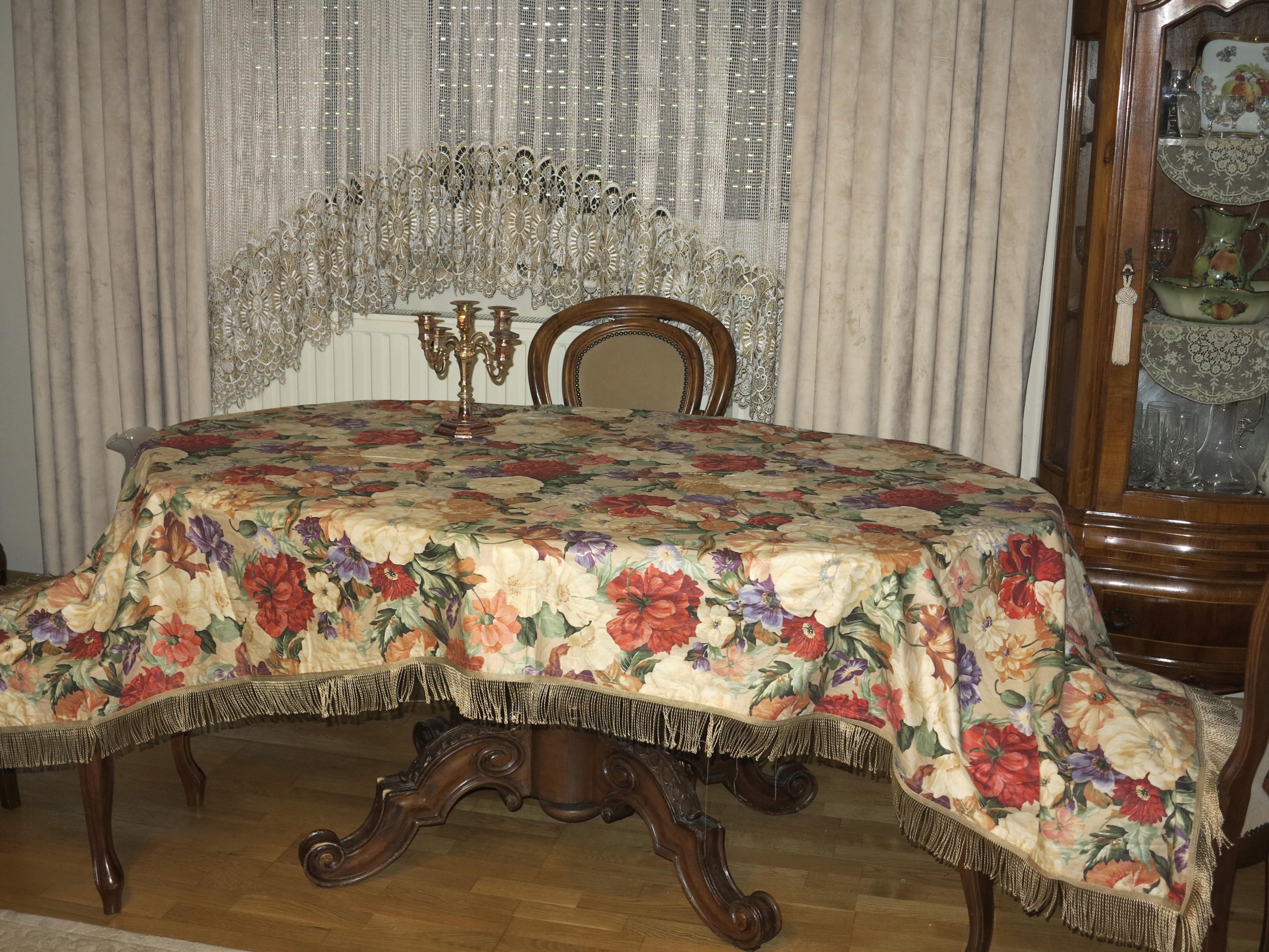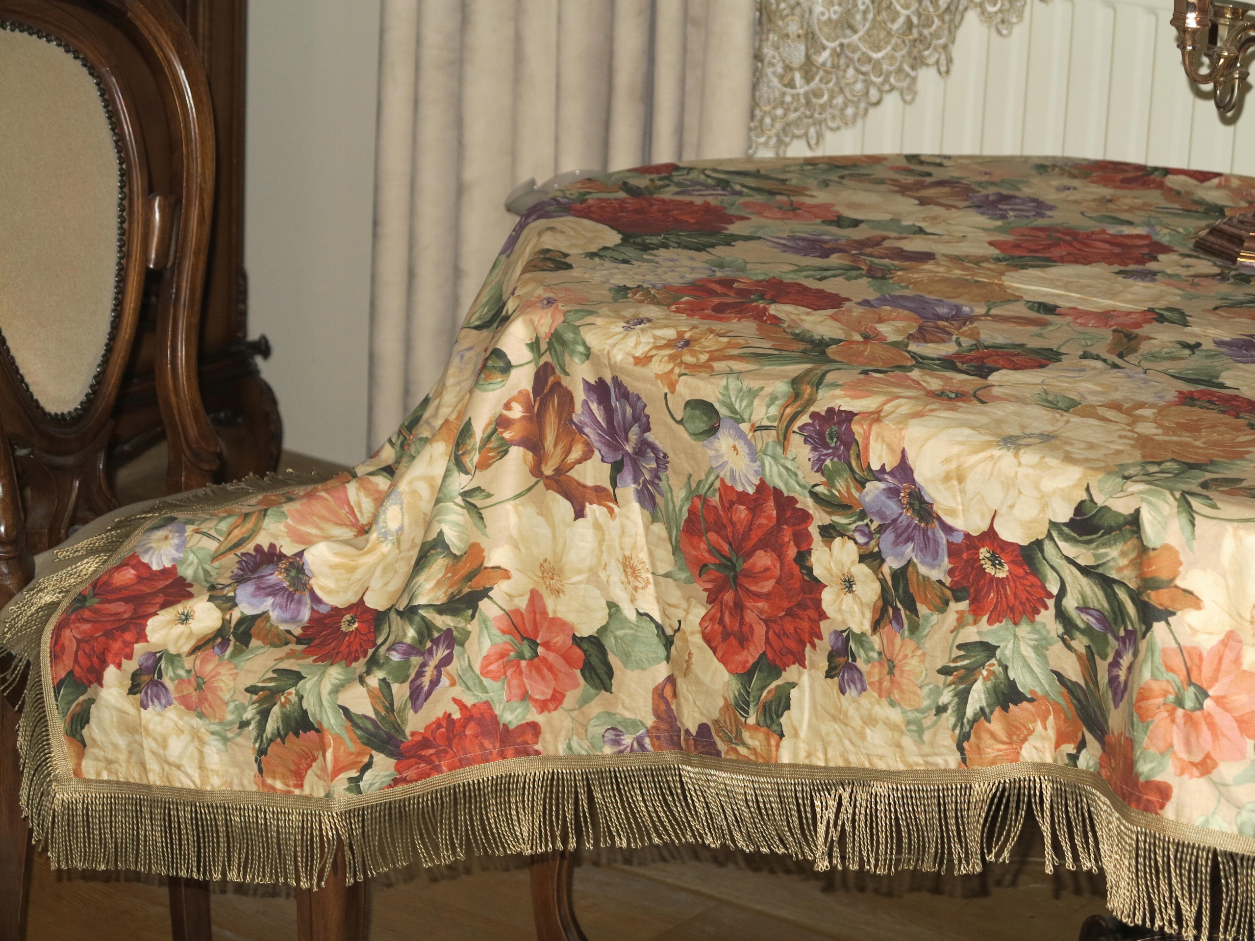 Размеры: 237/130 см+ для около 7 см. Использовала скатерть, но в супер хорошее состояние и качество. Я рекомендую, это будет красивое украшение стола.