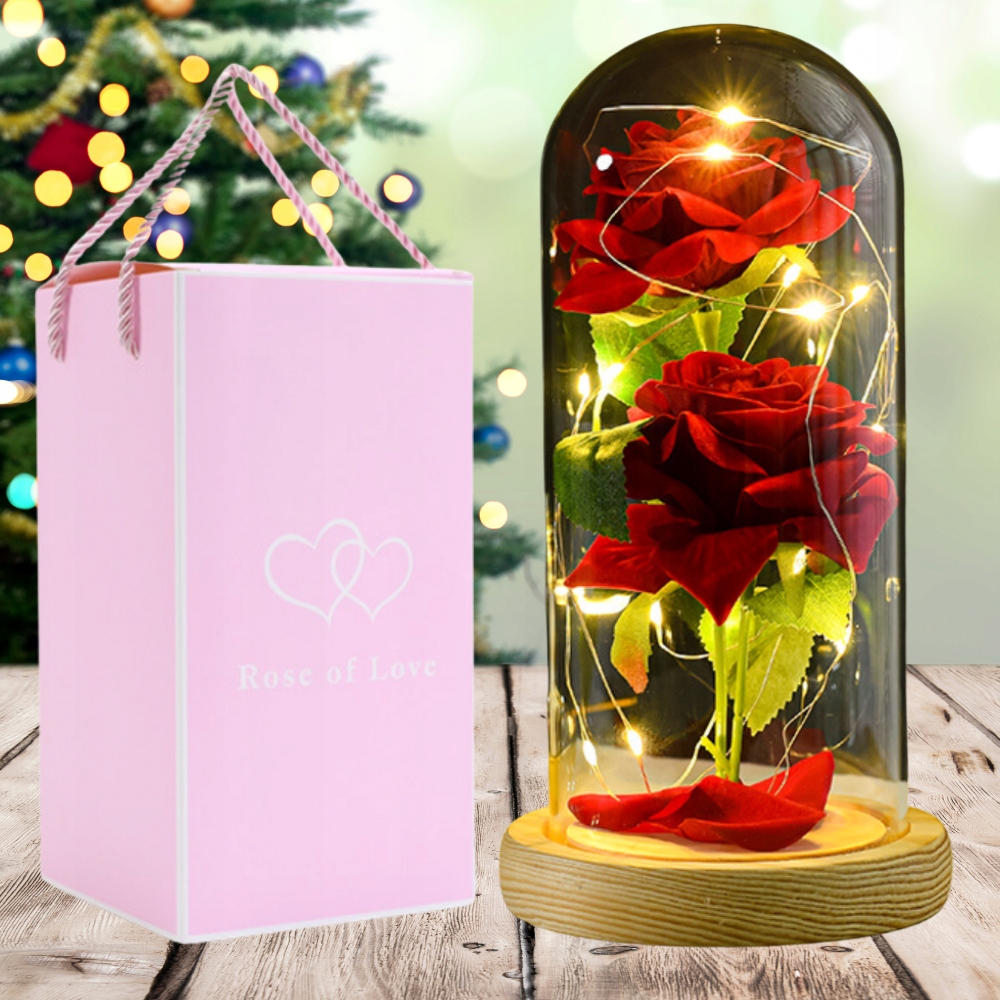 ПРЕКРАСНА ВІЧНА ТРОЯНДА У СКЛІ, ЧЕРВОНА СВІТЛОДІОДНА ПІДСВІЧКА, ПОДАРУНОК, ЯК СПРАВЖНЯ