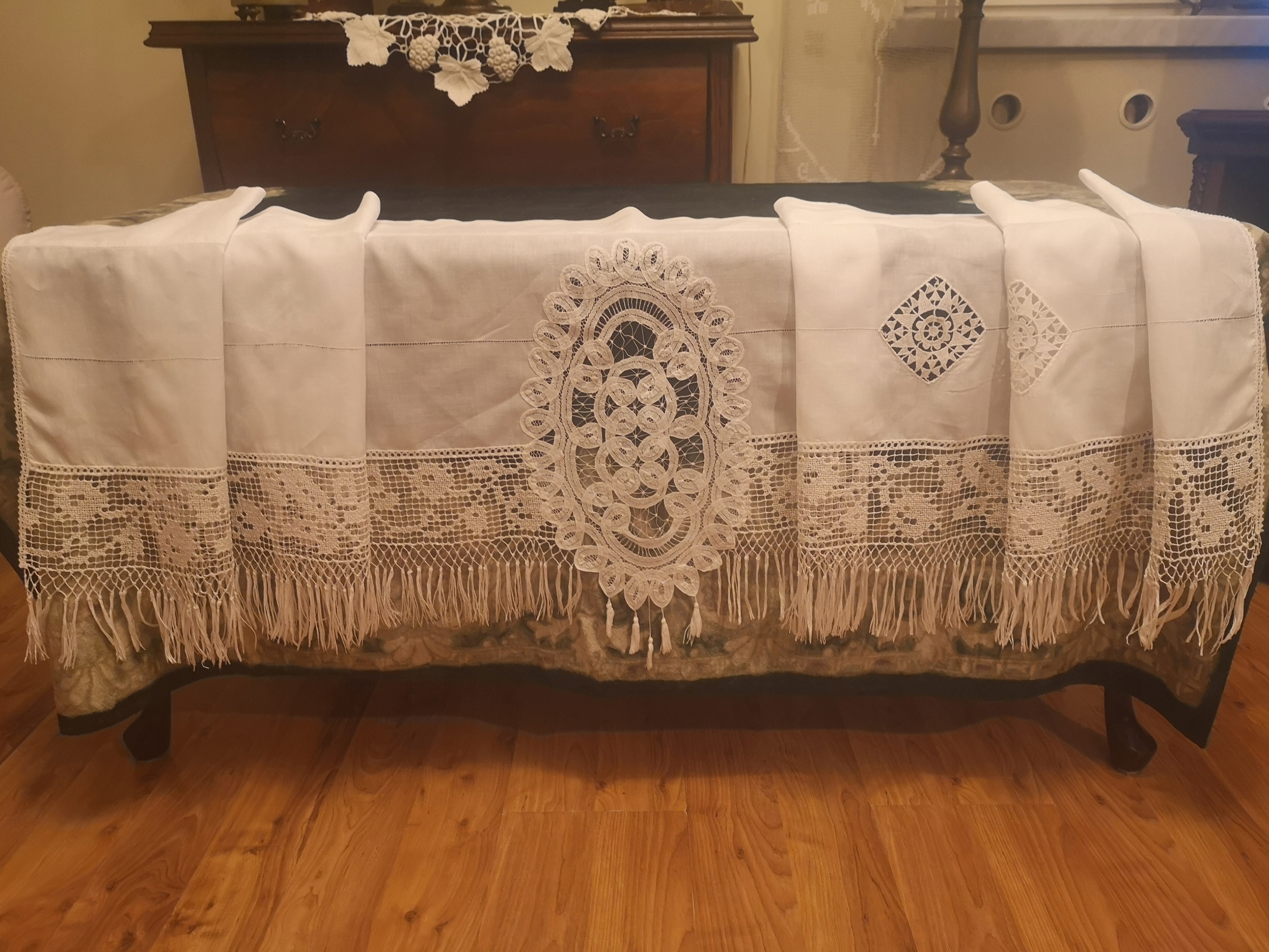 Красивый Лобрекун в тоне слегка сломанного белого; Самая плавная и предварительная вышивка на сетке. Обновленная ткань, все еще сильная, сохранившаяся в хорошем состоянии. Небольшое обесцвечивание может быть найдено в возрасте возраста; Он не заметит пятна, ссадины, отверстия, сеть без потрескавшихся швов. Широкий туннель для стержня. Принс: шириной 205 см, высота 41 см + полосы 9 см. Я приглашаю вас на аукцион и на другие мои аукционы.