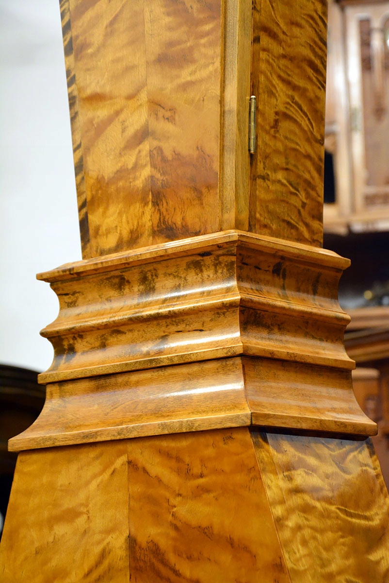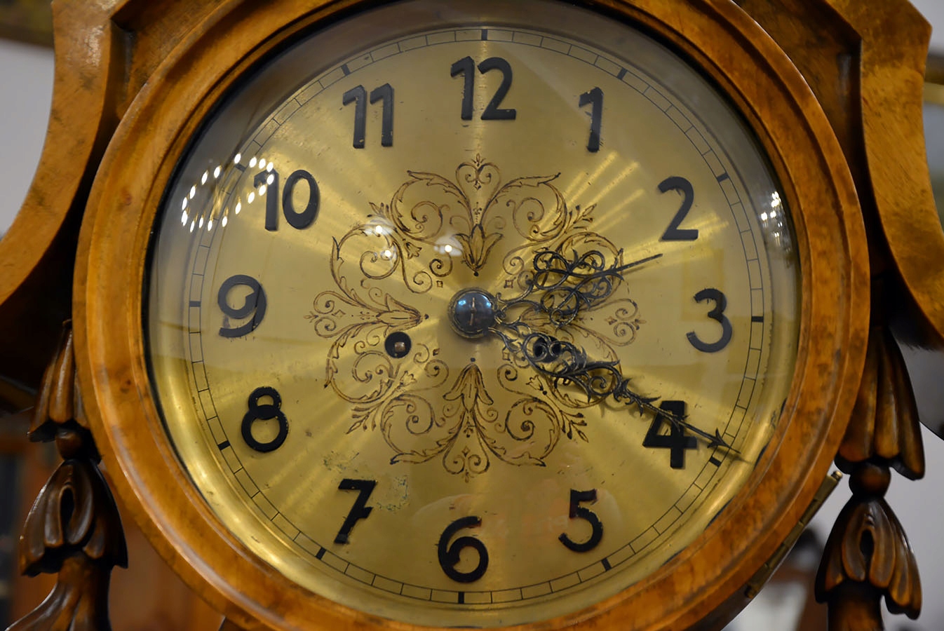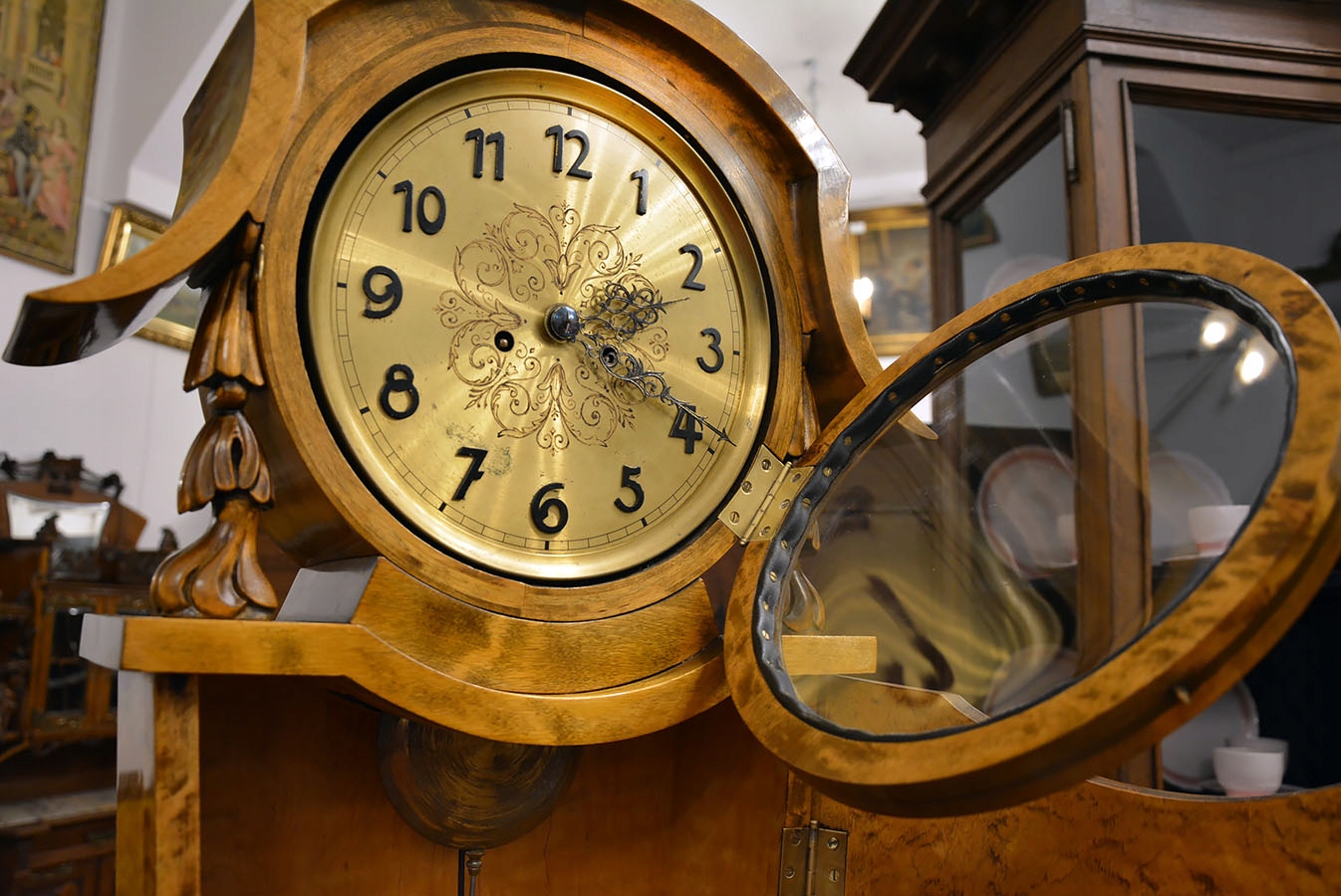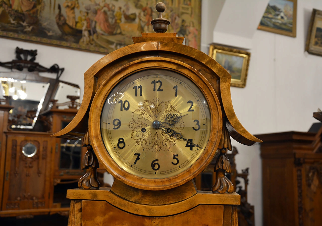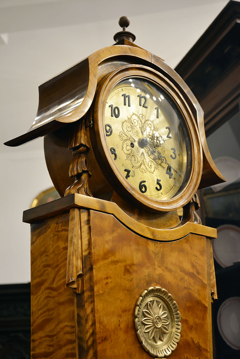 часы с профилированной и согнутой крышей и трюком наверху. Украшен резными цветочными мотивами.