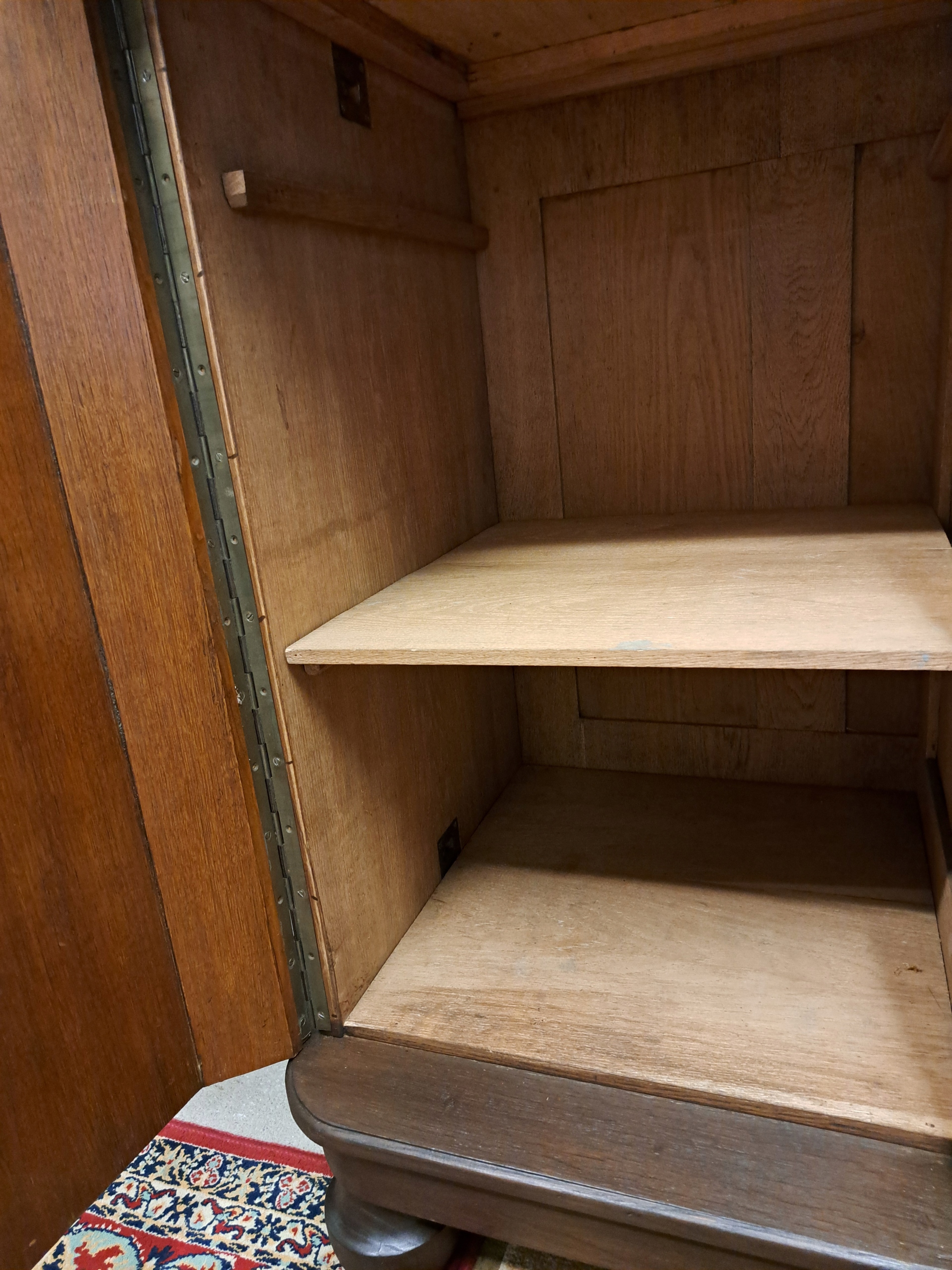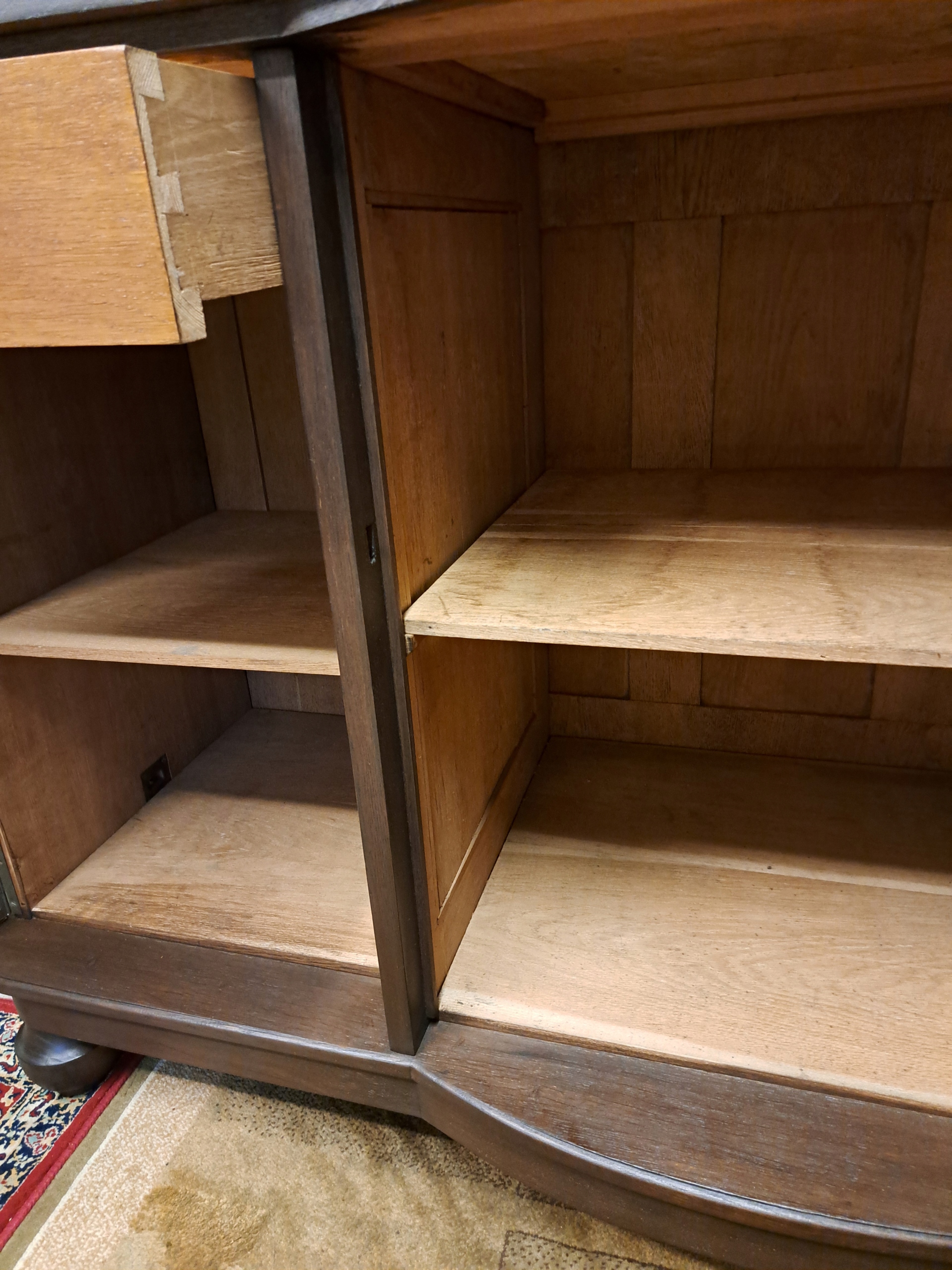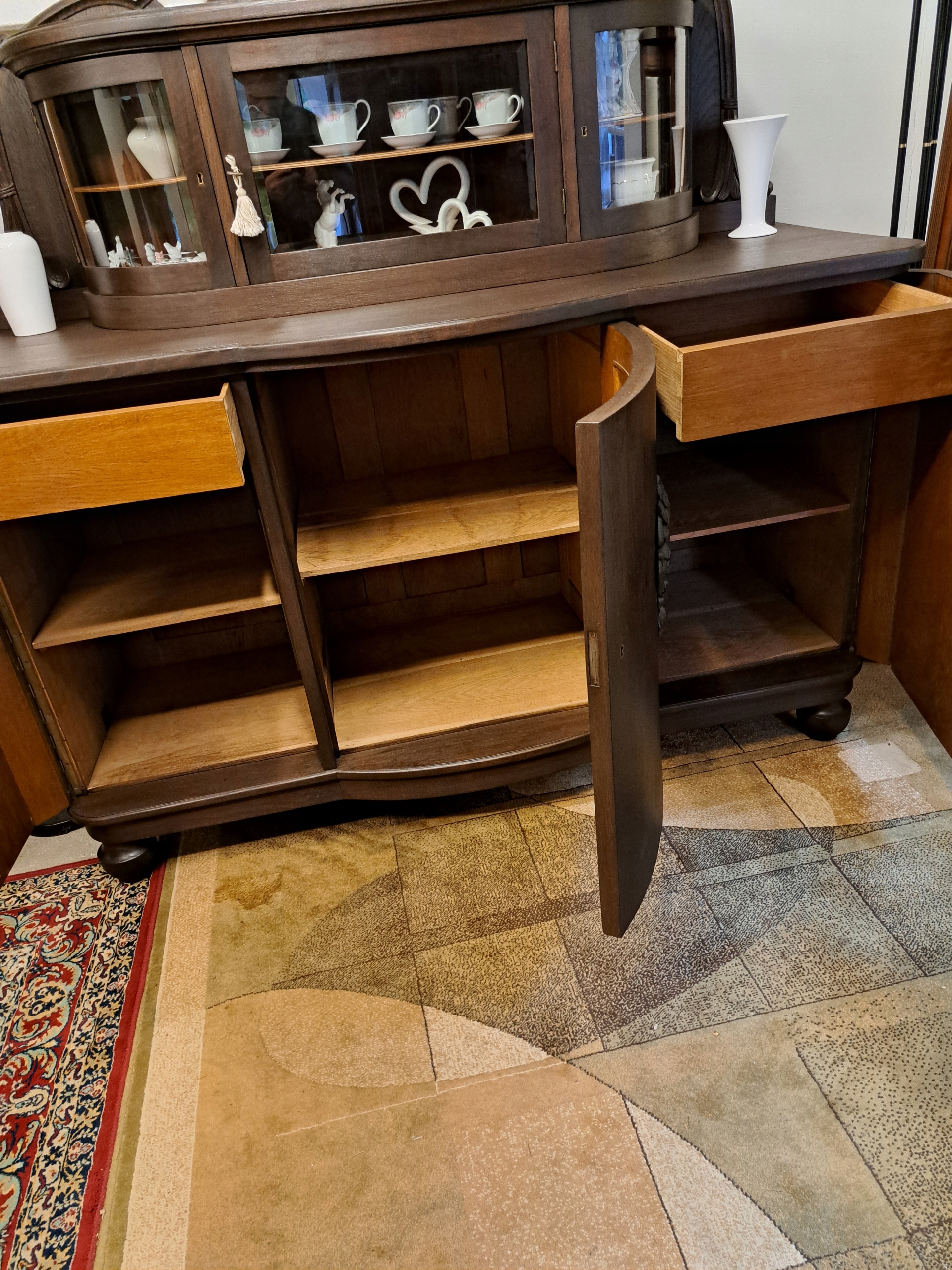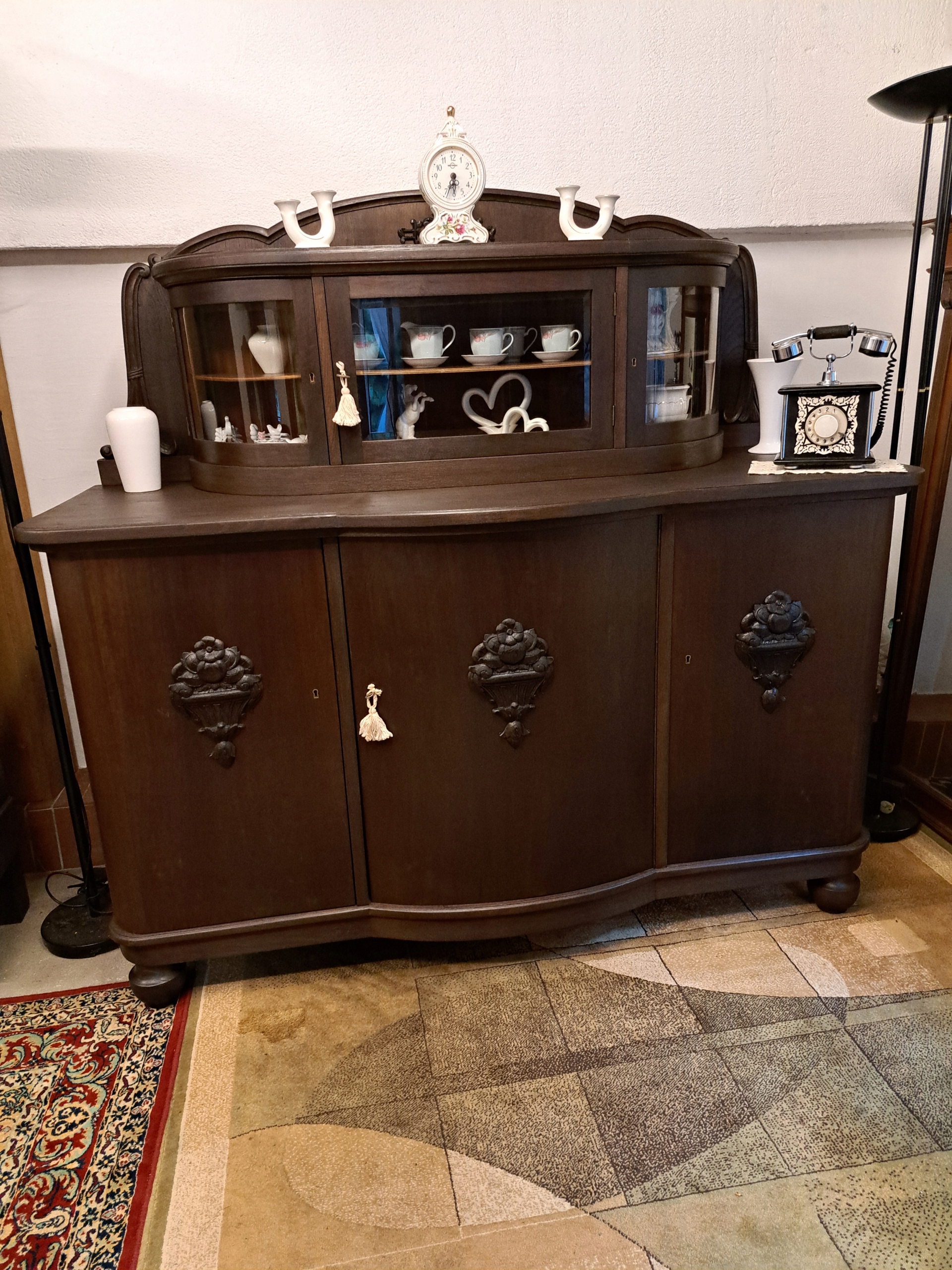 красивый буфет с расширением. Темный дуб, просто вставьте и восхищайтесь корой жуком. Мастерство исполнения, резьбы и его уникальности дают ему очарование и ценности. В нижнем левом шкафу 1 ящик и полка, на полке средней части посередине, в нижнем правом шкафу также 1 ящик и полку. Положите массивные круглые ноги спереди и массивными блоками сзади. Пост -up - верхняя часть глазурованной части. Ветры отшлифованы на окраине. За стеклом на каждой полке шкафа. Направление на основные факторы. Это очень полезно во время транспортировки и принесения домой, квартиры или офиса. Споведник имеет размеры: свет x высота x золото - 184 см х 106 см х 75 см góra -178 см х 65 см х 40 см общая высота - 171 см
