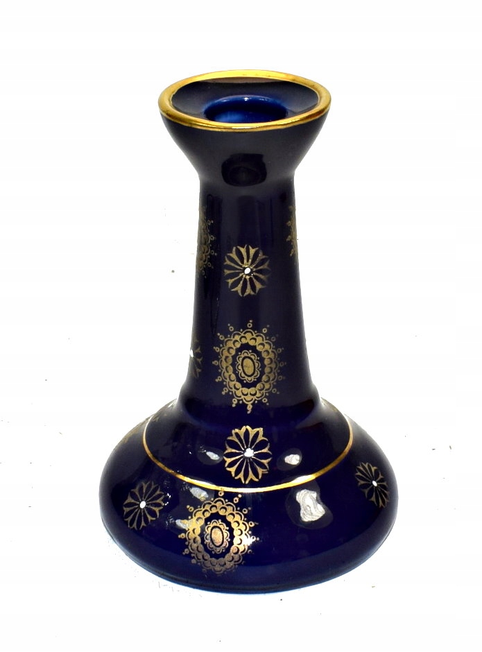 Я предлагаю старый подсвечник, сделанный из белого фарфора, украшенного кобальтом и позолочкой.
