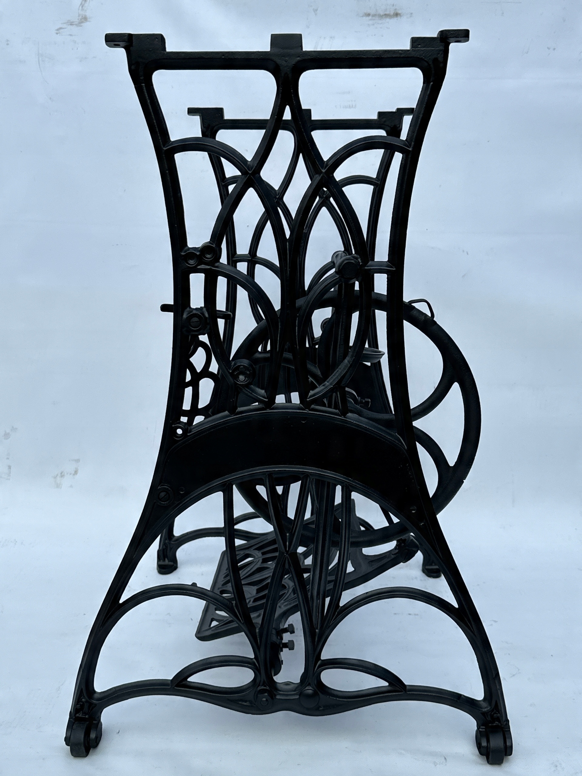 Объект продажи - старая чугунная основа от швейной машины Наумана. Очень хороший рисунок из толстого чугуна, менее распространенный. В центральной части логотипа компании. У него оба колеса в нижней части. Дополнительным преимуществом является металлический элемент, соединяющий колесо с педалью, благодаря которой мы уверены, что его не будут съедены деревянными вещами, что возможно на базах с деревянным элементом.