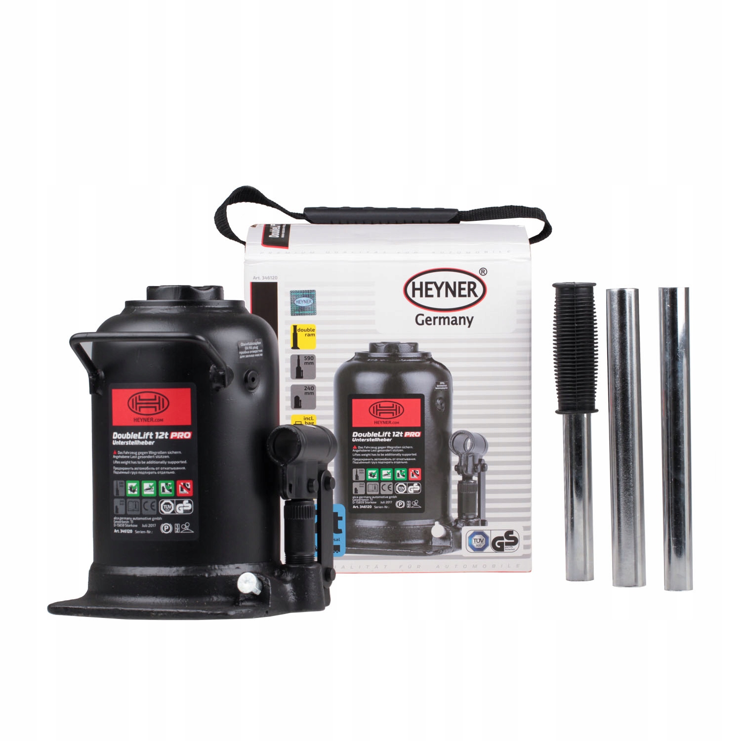 Для удобства и экономии места при хранении в комплект входит сумка для хранения. HEYNER DoubleLift 12t PRO — качественный и безопасный инструмент для замены шин или других работ, связанных с подъемом автомобиля.