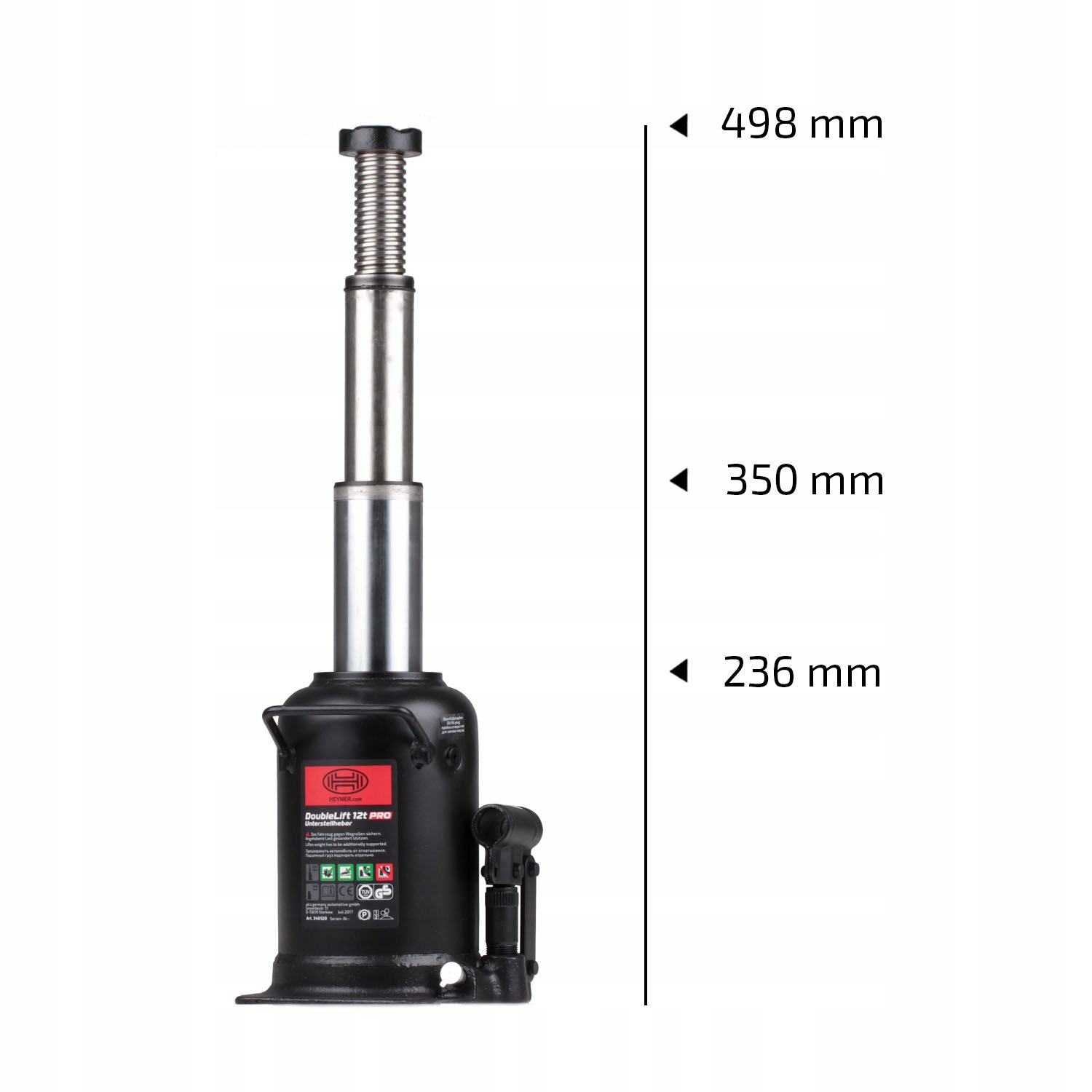 Надежный и универсальный гидравлический подъемник HEYNER DoubleLift 12t PRO обеспечивает стабильную высоту подъема от 236 до 498 мм с помощью прочного трехступенчатого поршня возвратно-поступательного движения (хром). При весе около 14,9 кг нижняя тяга отлично управляется. Диапазон хода составляет 262 мм.