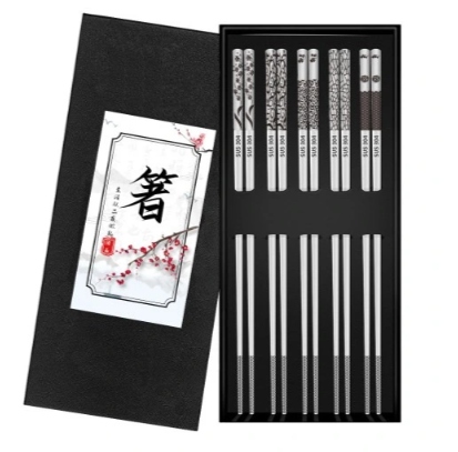 Металлические резки палки в японском корейском стиле. Длина наших палочек из нержавеющей стали составляет 23,5 см, легкую адгезию и простую для удержания и схватки/сцепление пищи. Структура против SLIP предотвращает снижение палочек в общей сложности 5 различных узоров, вырезанных наверху в одной подарочной коробке
