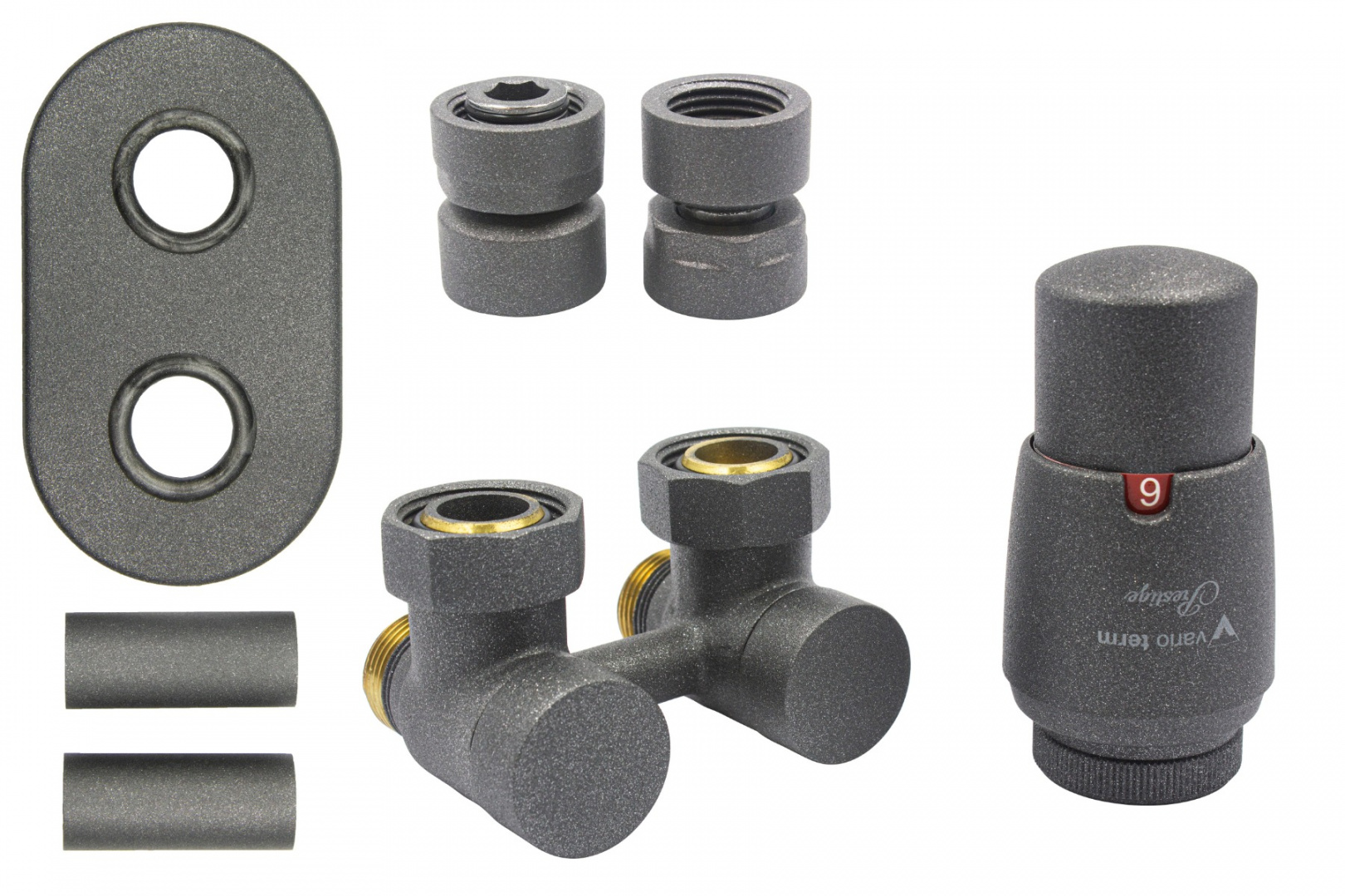 В комплект входят: 1 термостатическая головка «Престиж» , 1 угловое соединение с расстоянием между монтажными соединениями 50 мм, 1 двойная маскирующая розетка, 2 маскирующие втулки и 2 1/2 монтажных соединителя с наружной резьбой.