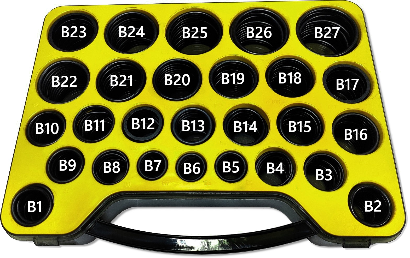 Уплотнения в разных размерах, обернутые в твердую пластиковую коробку , закрытые с двумя сильными защелками .