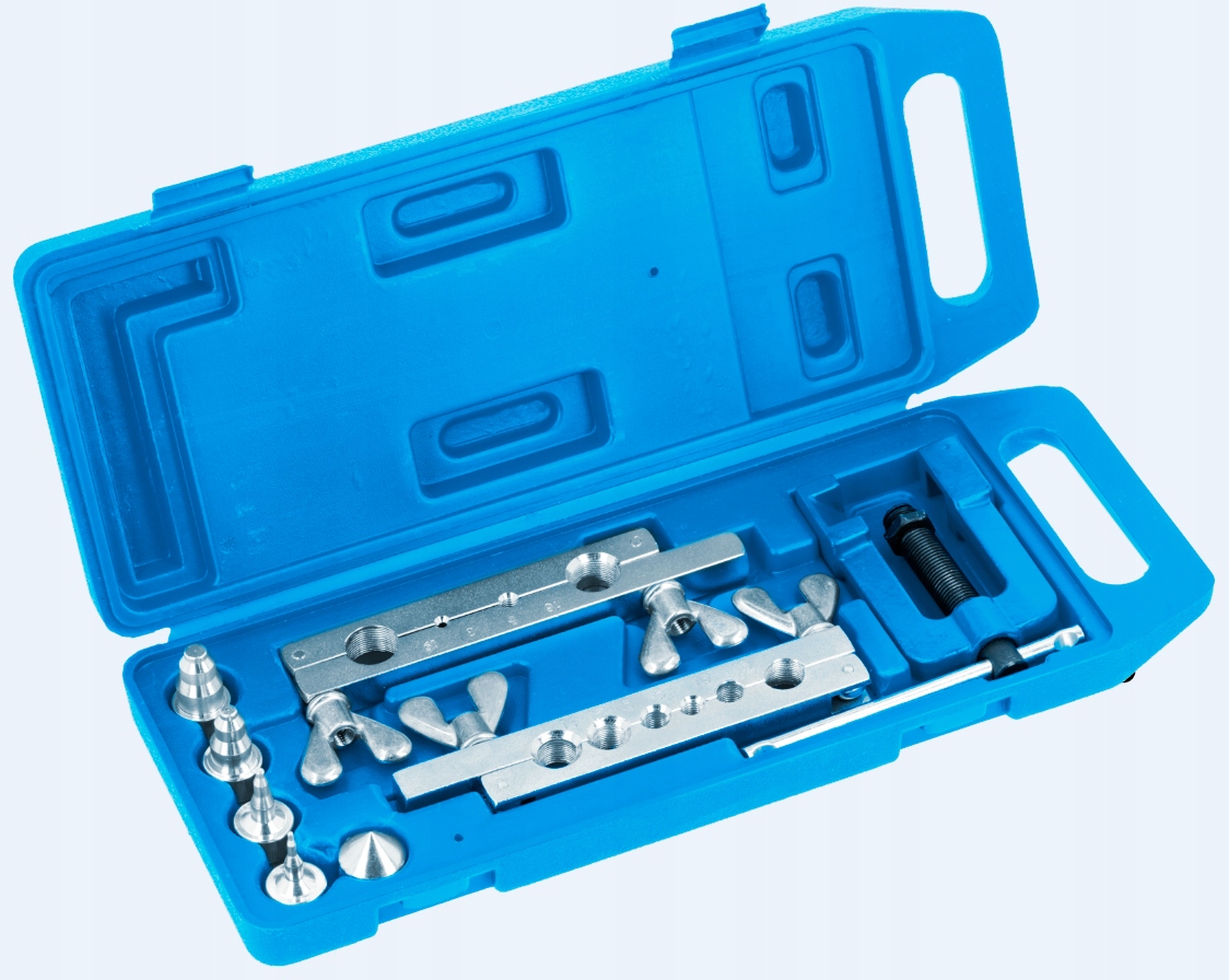 Пресс для ручной развальцовки труб из стали, цветных металлов, алюминия и пластмасс. Для изготовления конических соединительных фланцев под углом 90°. Набор предназначен для монтажных, автомобильных и строительных работ.