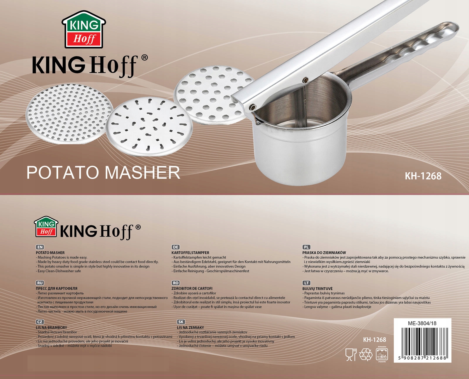 Стальной пресс для картофельного пюре KINGHOFF со сменными ситами. Изготовлен из нержавеющей стали.
