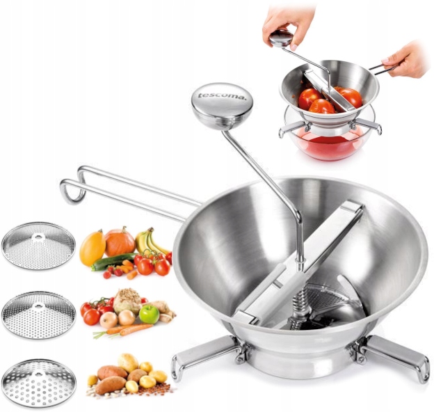 - Оснащена 3 ситечками для пюрирования и лопаткой, облегчающей приготовление пюре из большого количества овощей и фруктов.