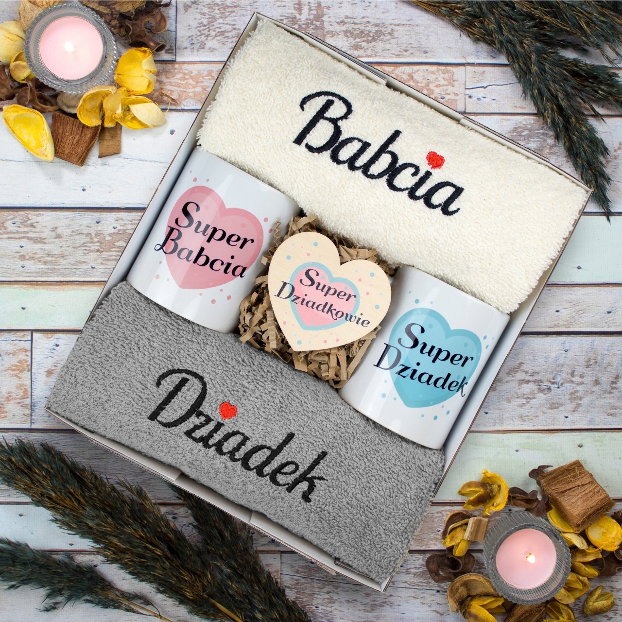 PREZENT DLA BABCI i DZIADKA NA ŚWIĘTA RĘCZNIKI i KUBKI ZESTAW DLA DZIADKÓW