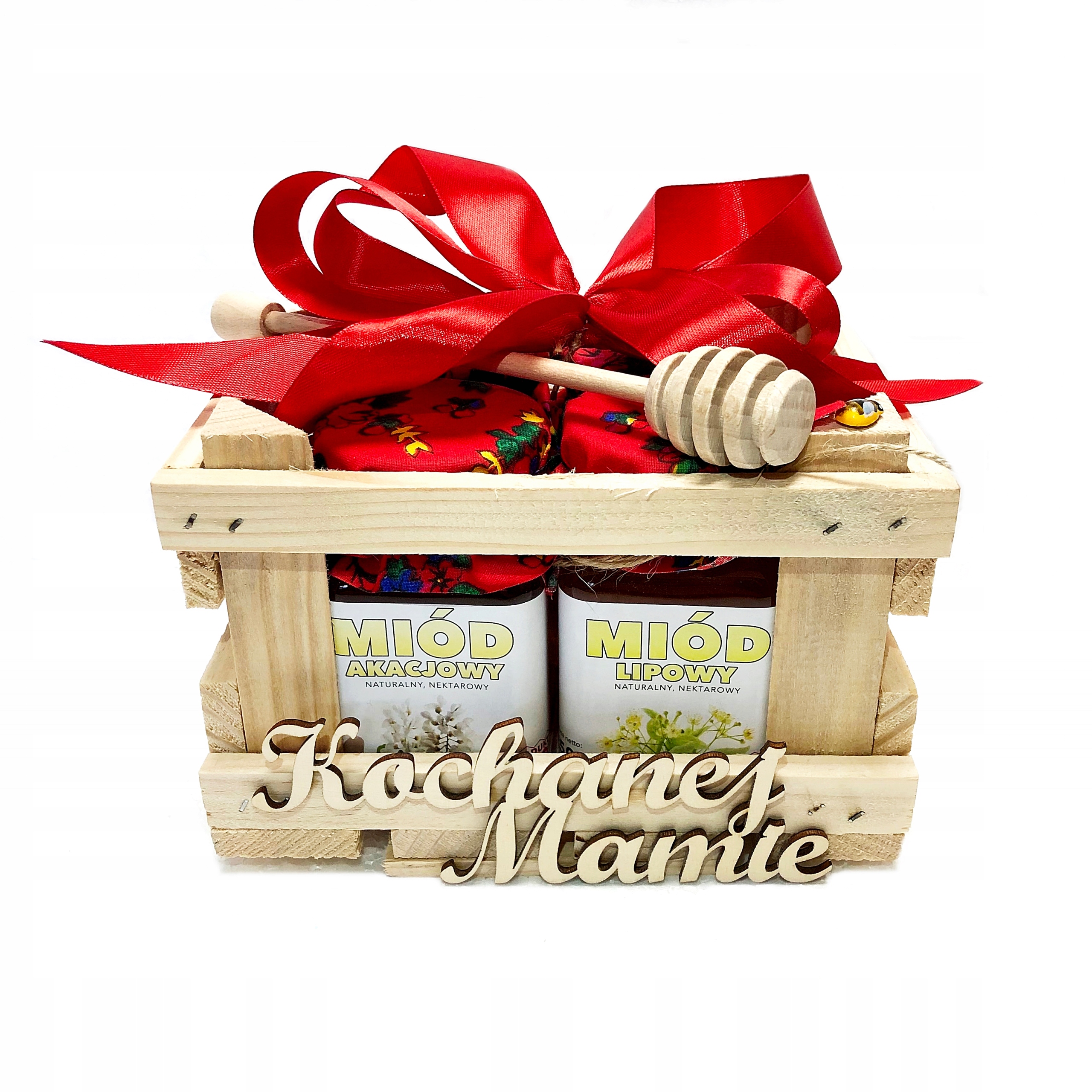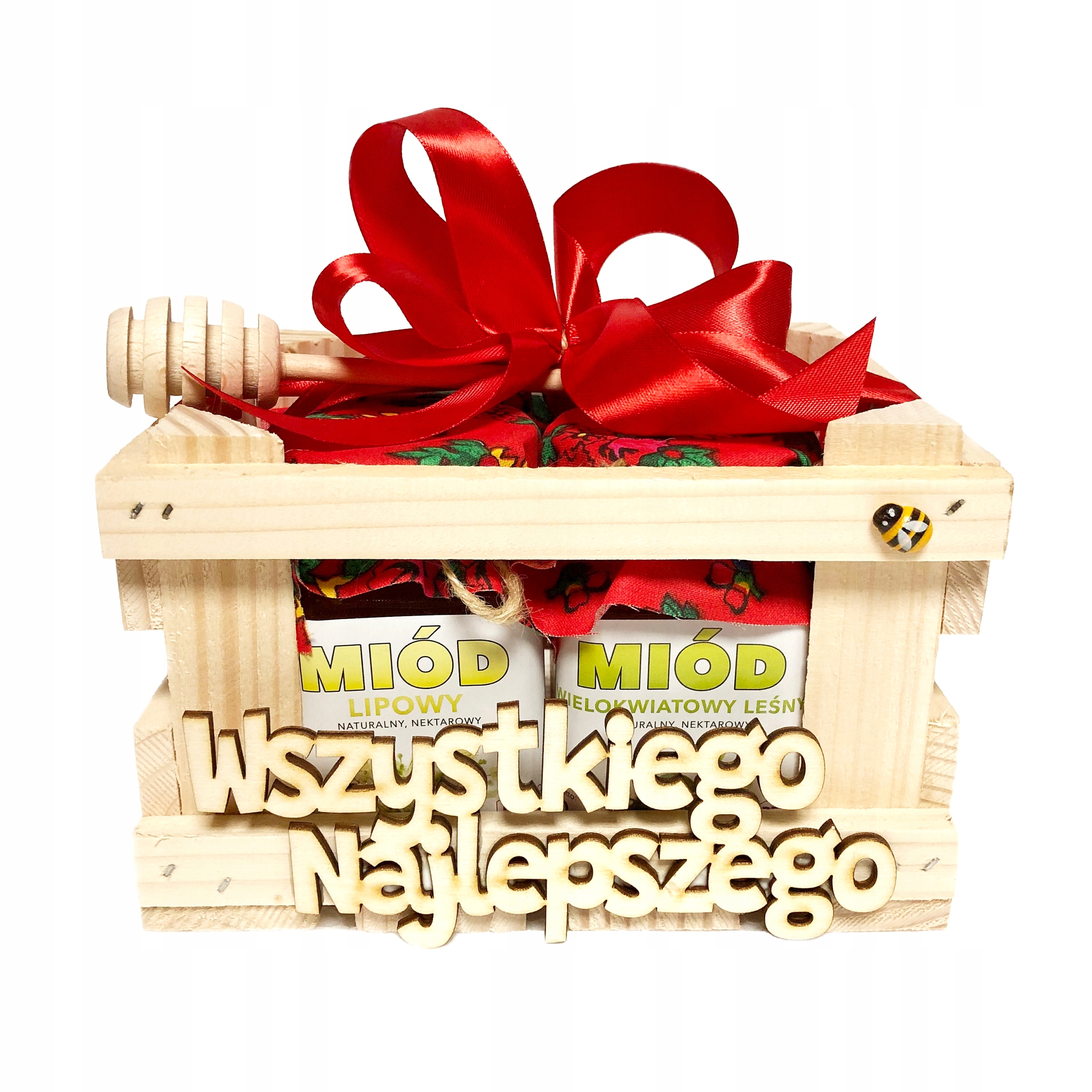 - Все меды украшены декоративным краснымматериалом и упакованы в деревянную коробку.