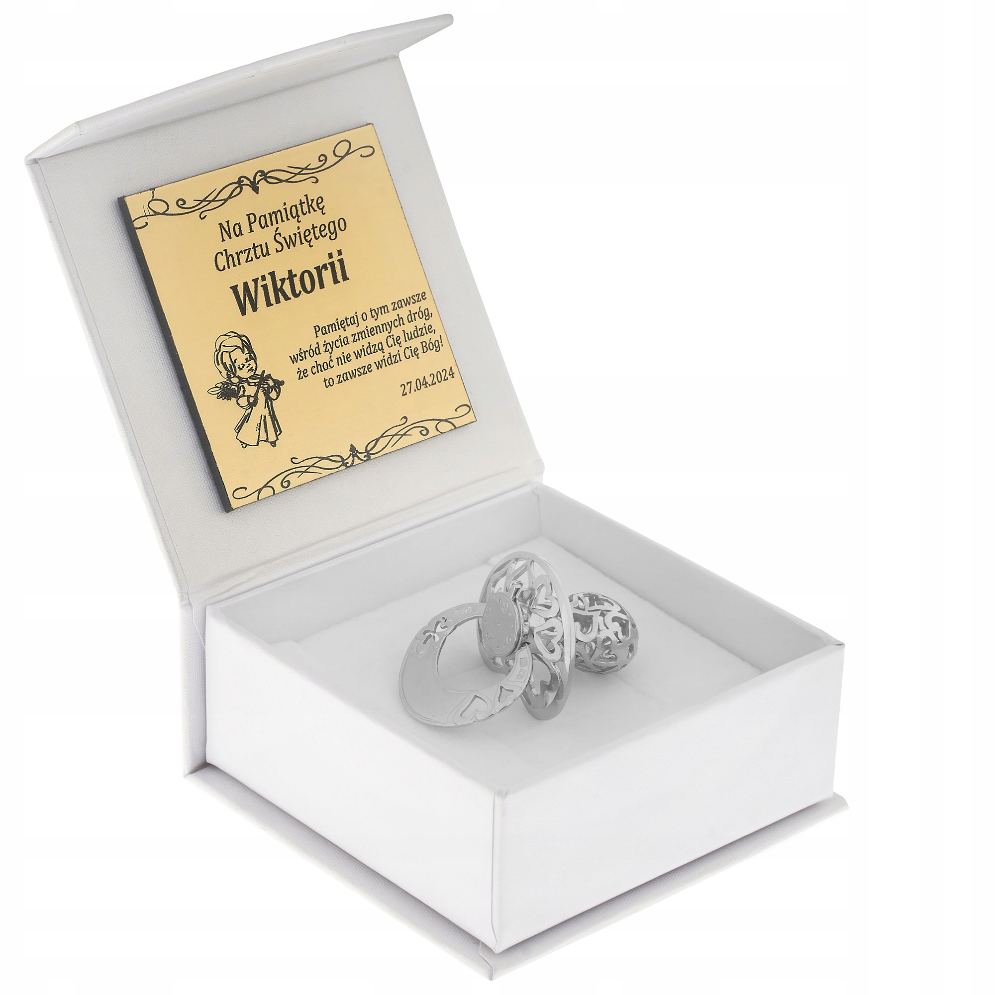 Элегантная серебрянаяпустышка с гравировкой - это Идеальный подарок на крещение или годовалый день рождения. Упаковано в элегантную коробку в сопровождении сертификата подлинности. Прекрасный сувенир на всю жизнь.