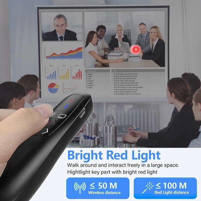 - [Управление на большом расстоянии] Дистанционное управление презентацией оснащено красным светом, который хорошо виден на большинстве фонов. В ключевых областях слайдов, чтобы привлечь внимание аудитории, красный свет проецируется на расстояние 200 м, дальность беспроводного управления до 50 м, все место покрыто, и вы можете стоять в каждом углу и гибко управлять им с помощью дистанционного управления.