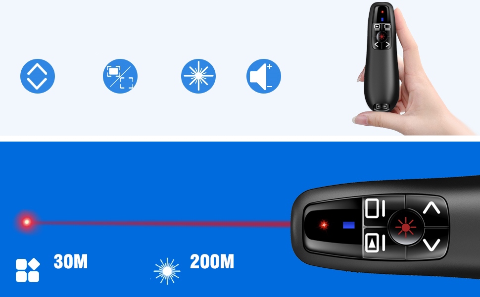 - ✅Устройство Powerpoint Page Turner с лазерной указкой имеет беспроводной пульт дистанционного управления на расстоянии до 30 метров и дальность действия красной указки до 200 метров,