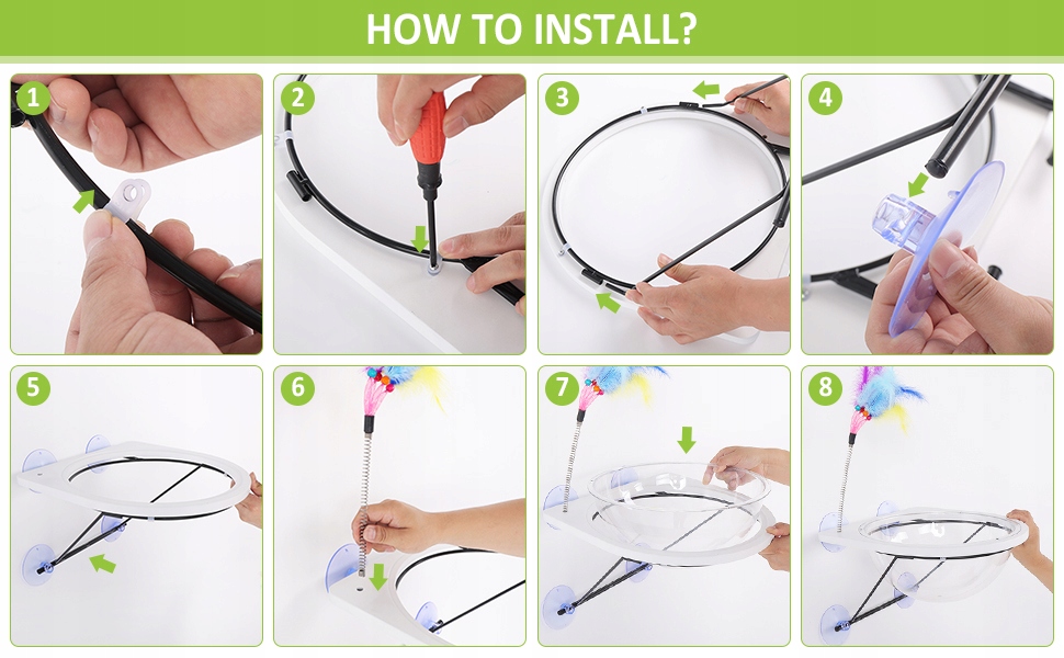 🐱【 Легко установить и демонтировать】】 Просто установите верхний и нижний кронштейн вместе, положите 4 всасывающие чашки в фиксированное положение, а гамак для кошки будет очень закрыт для разных гладких поверхностей, таких как стекло, керамическая плитка, из нержавеющая сталь и зеркало.