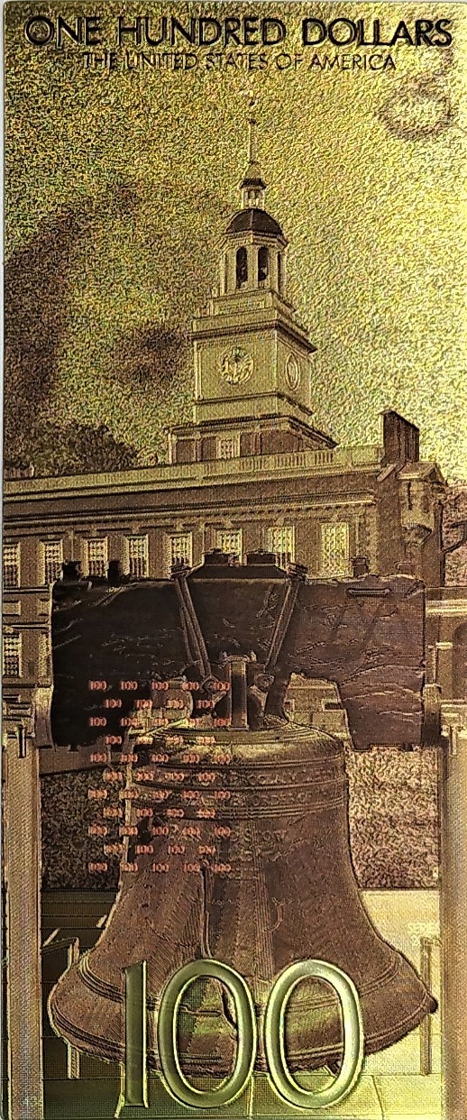 На аверсе банкноты изображен Бенджамин Франклин. Он был одним из отцов-основателей Соединенных Штатов, но так и не стал президентом. Он является автором многократно перефразированного высказывания «В ЭТОМ МИРЕ ЕДИНСТВЕННО ОПРЕДЕЛЕННЫЕ ВЕЩИ — СМЕРТЬ И НАЛОГИ».
