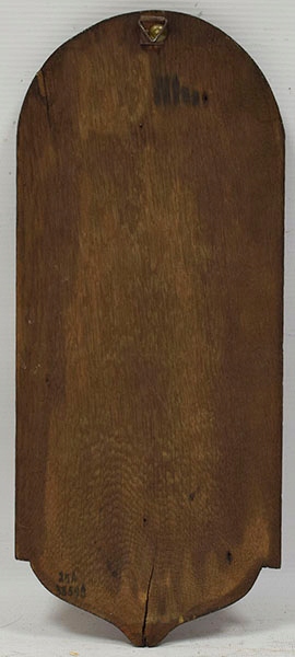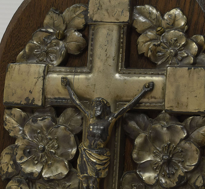 Старинная чаша с крестом из посеребренной жести в деревянной рамке.