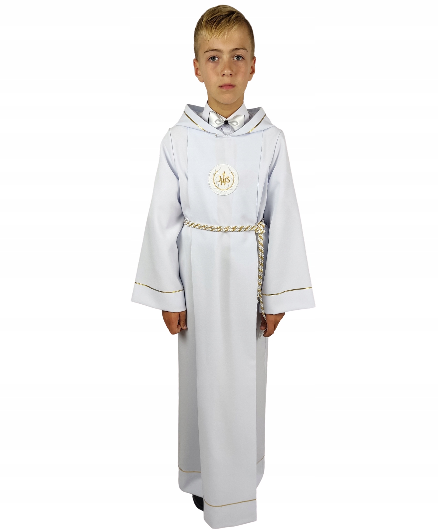 Безупречно-белый альб с капюшоном – типичный наряд мальчика для первого причастия.