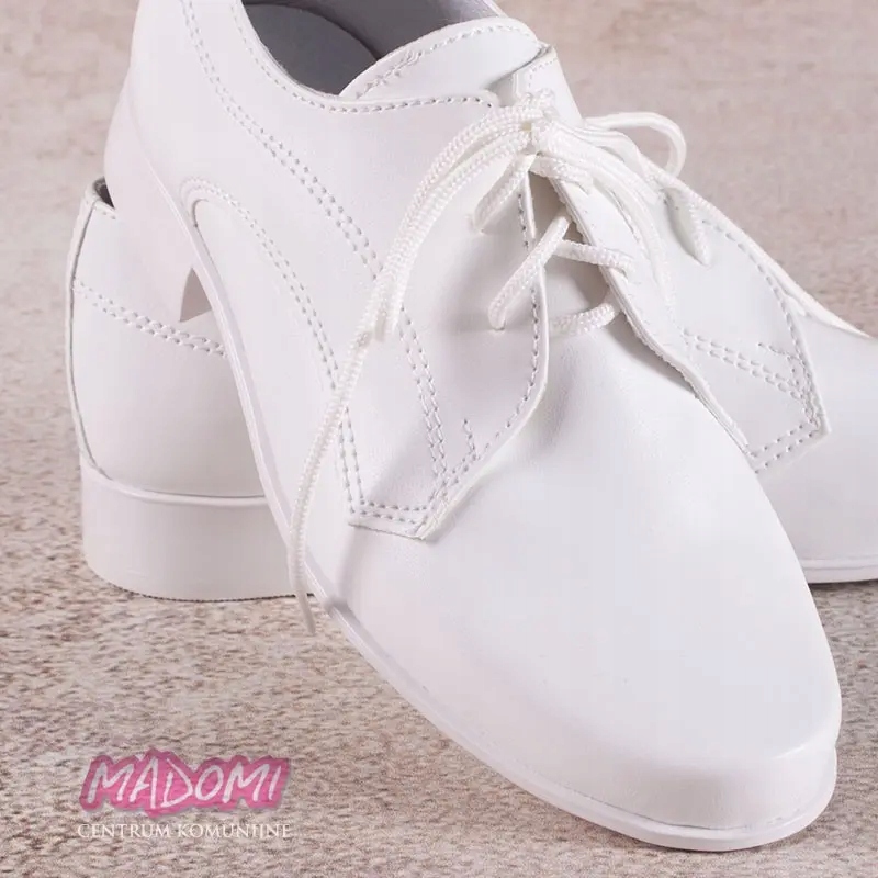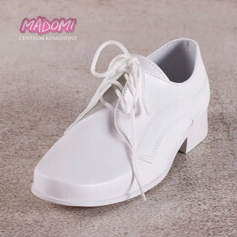 Очень элегантные белые туфли для причастия для мальчика от польского производителя обуви MIKO. Изготовлен из мягкой экологической кожи, стелька из натуральной кожи. Туфли на шнуровке, к ботинкам прикреплены шнурки. Небольшое закругление спереди.