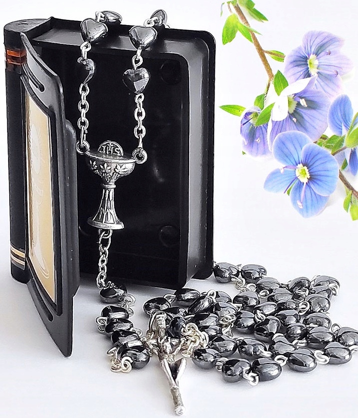 КРАСИВЫЕ ЧЕТКИ ДЛЯ ПРИЧАСТИЯ ИЗ ГЕМАТИТА В ФОРМЕ СЕРДЦЕВ ГРАФИТОВОГО ЦВЕТА В КОРОБКЕ И КНИГЕ - ИТАЛЬЯНСКИЕ ЭЛЕМЕНТЫ: ЧАША IHS, КРЕСТ И ЦЕПЬ
