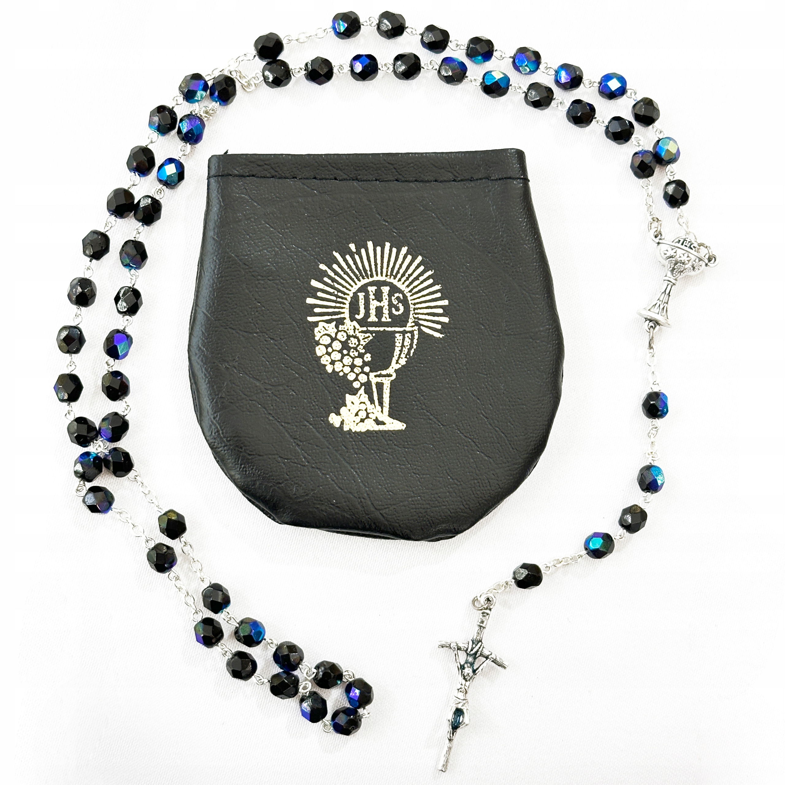 * ЧЕТКИ изготовлены из бусин кристаллической формы, которые переливаются на свету. Папский крест, чаша IHS и соединители выполнены из металла.