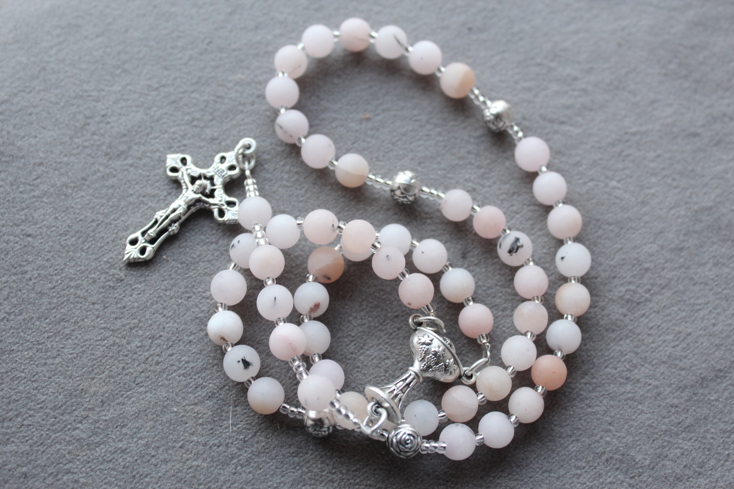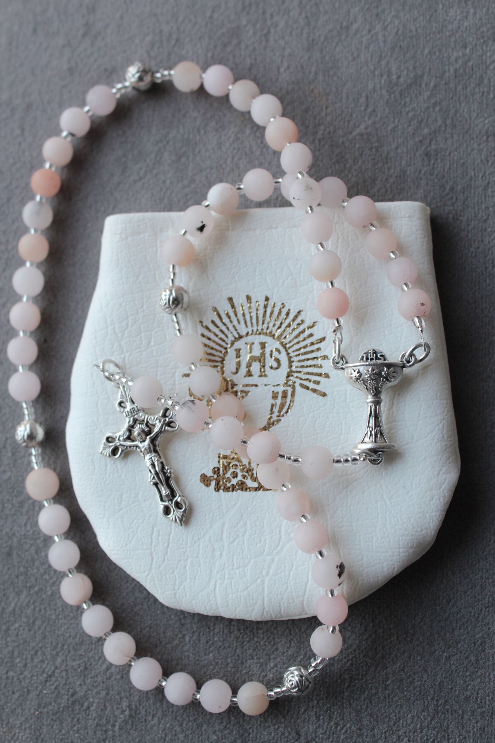 Причастие Розария Святое Причастие, сделанное из опал -розовых камней + кабины IHS