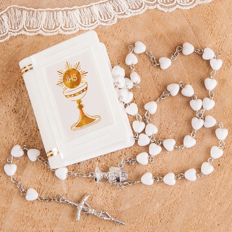 Деликатный причастие для девушки, сделанная из белых сердец в форме сердец, является обязательным для первого святого причастия. Его тонкая внешность и символика любви и духовной близости делают его идеальным выбором в память об этом уникальном праздновании.