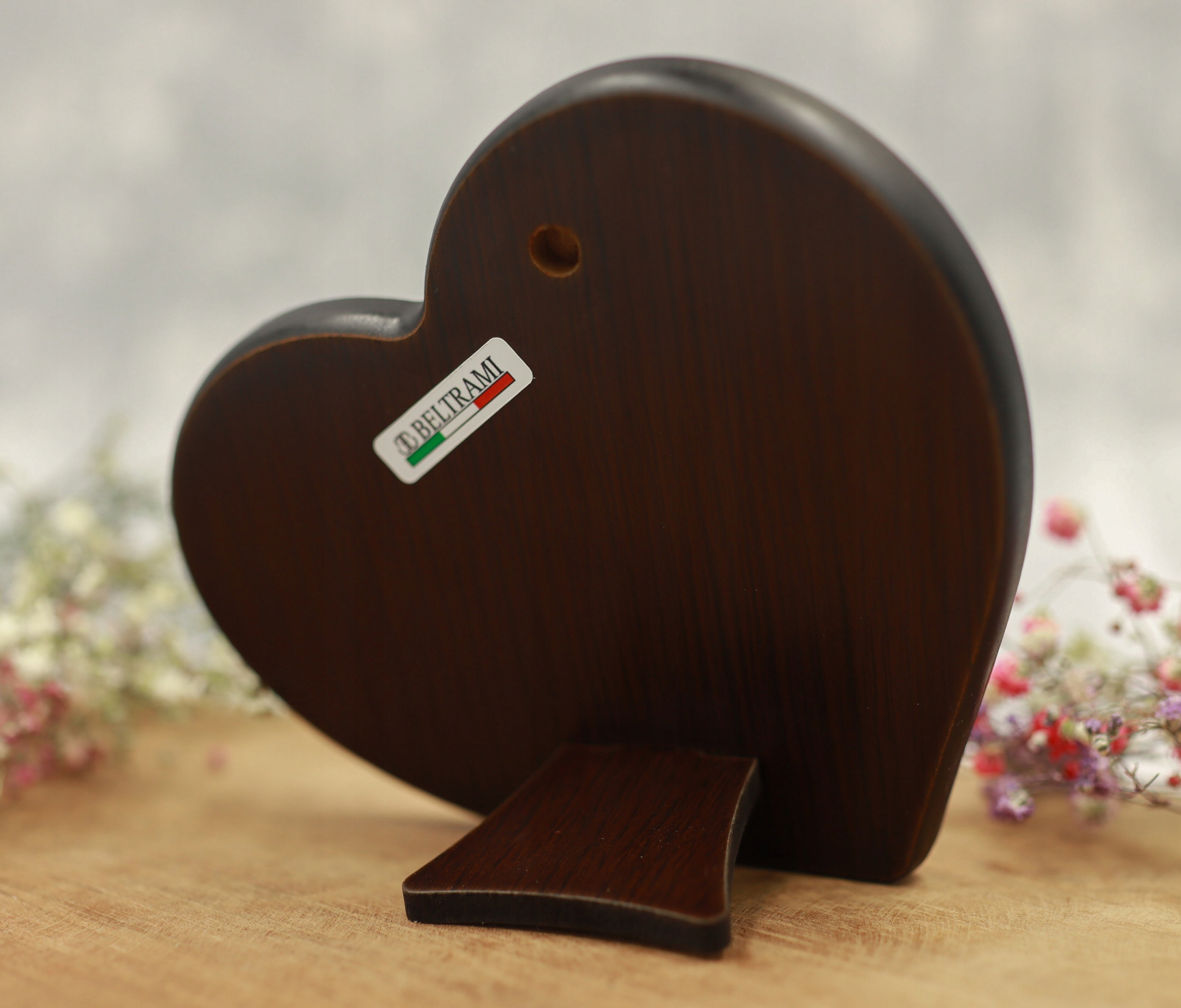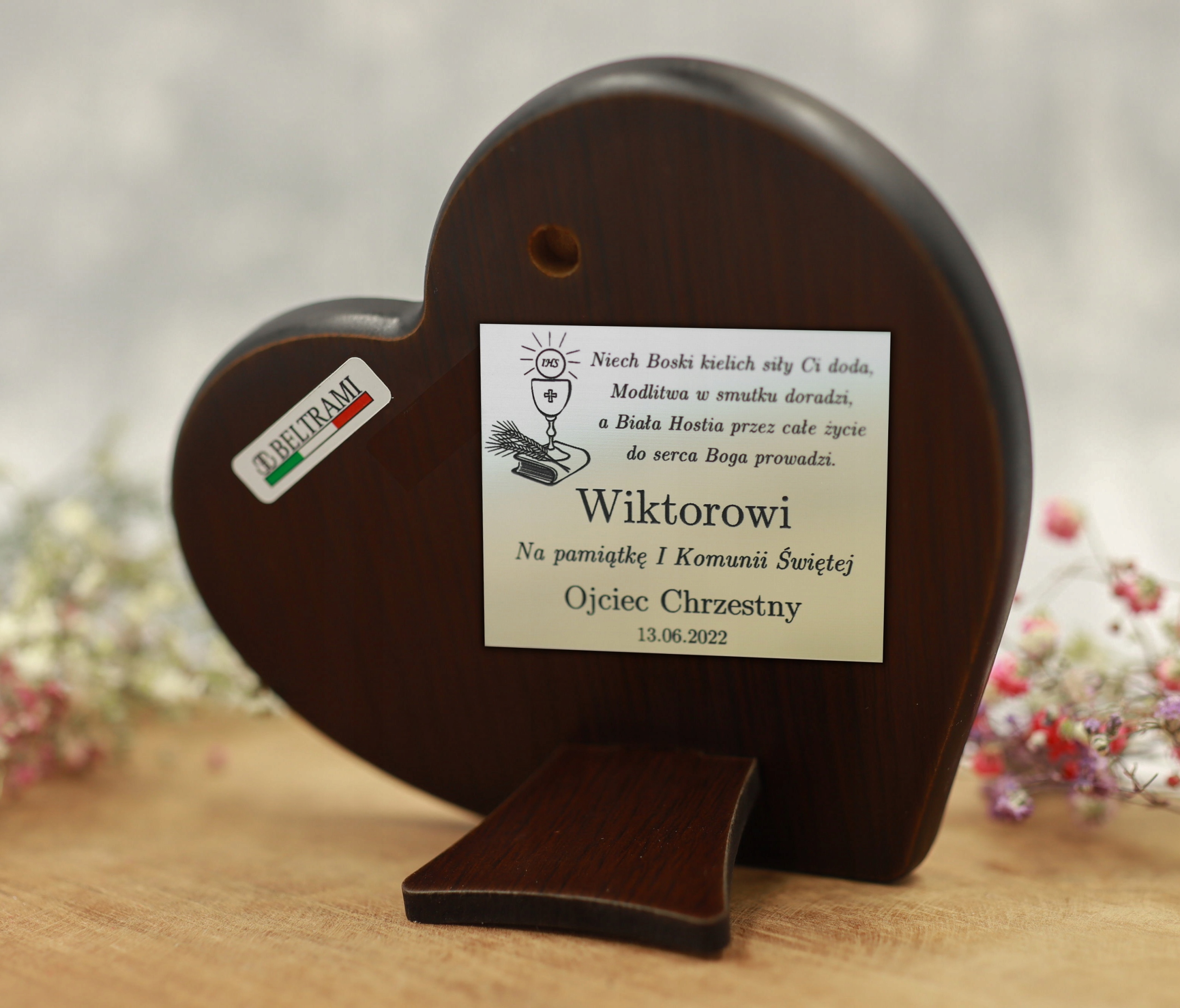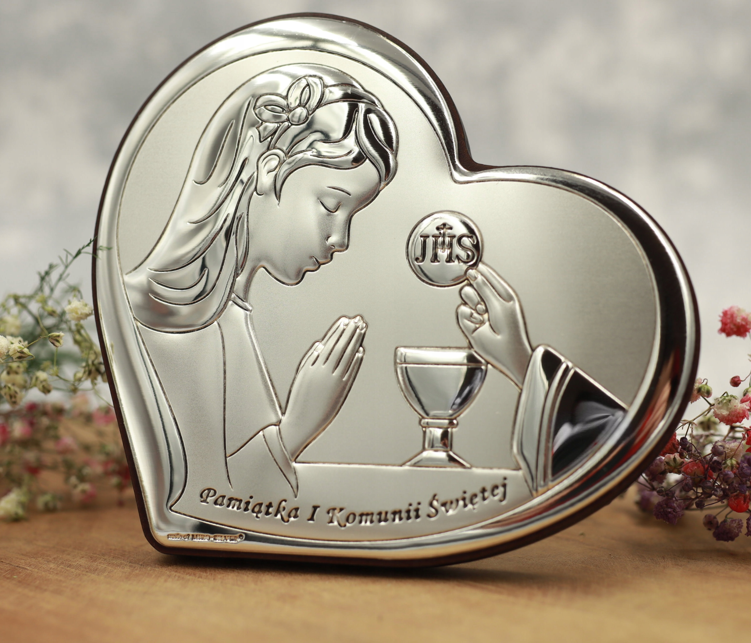Сувенир от итальянской компании BELTRAMI с изображением Девушки, принимающей Таинство Первого Святого Причастия б>. Вся вещь была закрыта в форме классического сердца с надписью"Сувенир Первого Святого Причастия". Картина установлена на коричневом лакированном дереве. Благодаря вставленной подставке картину можно разместить на комоде или повесить на стену.
