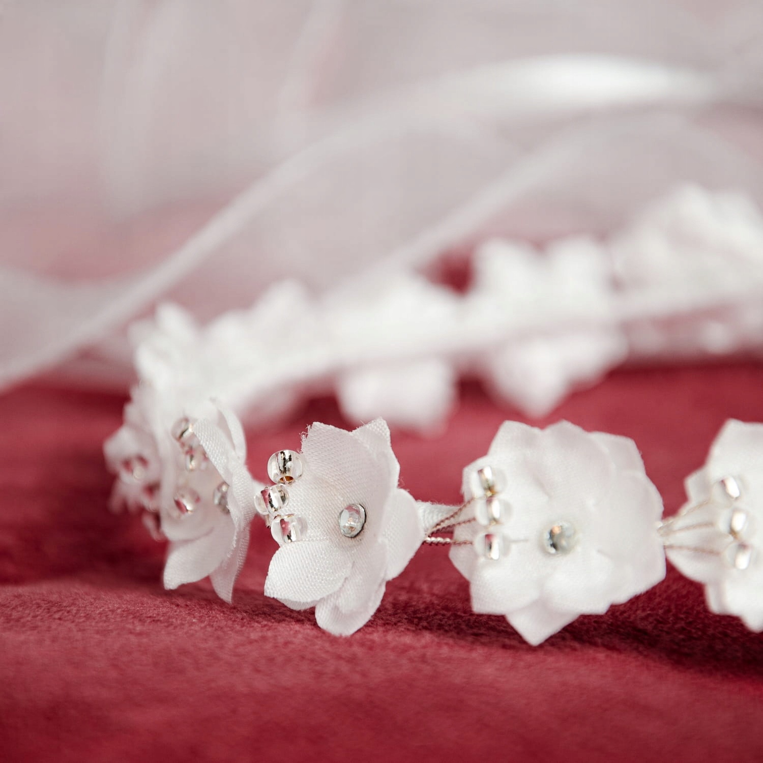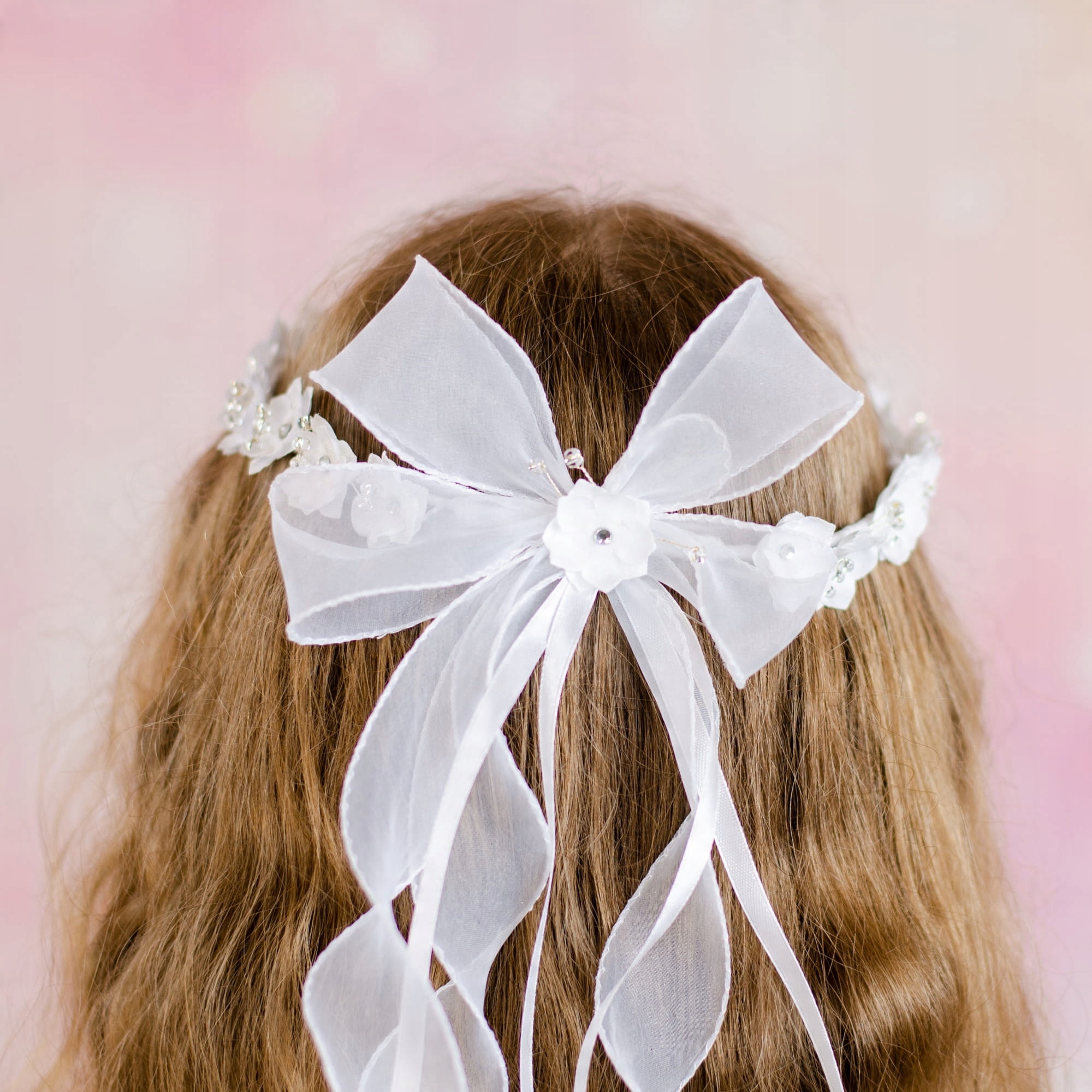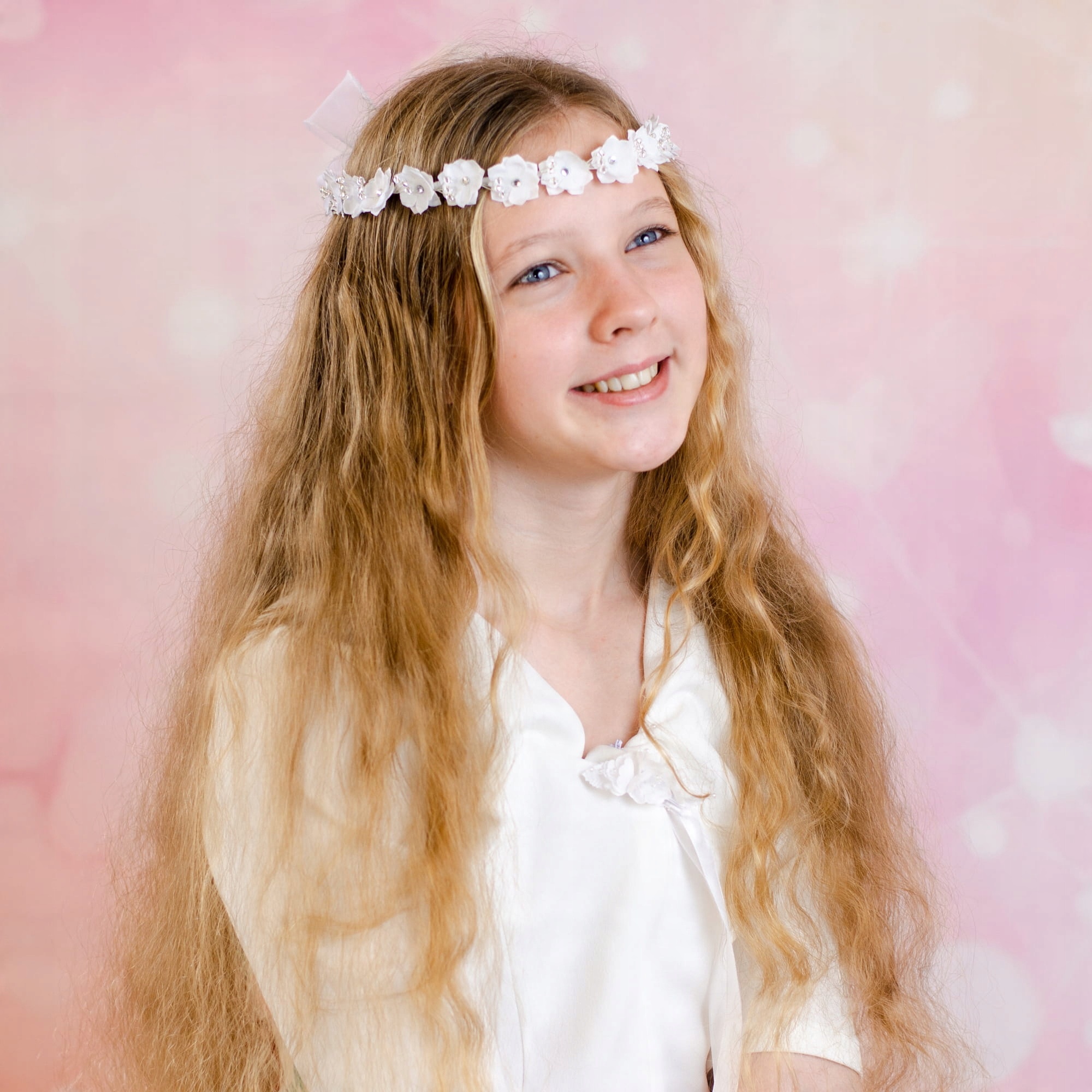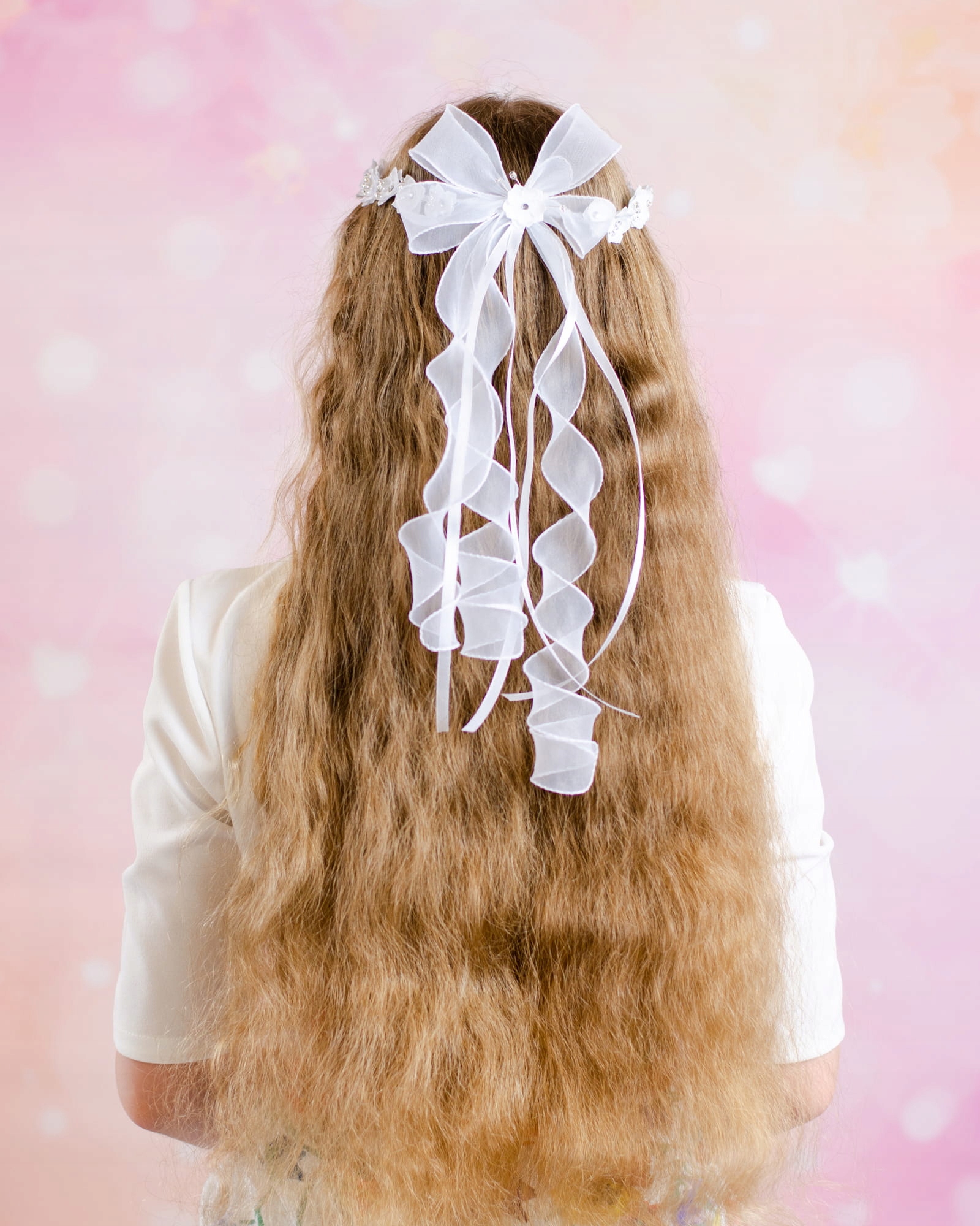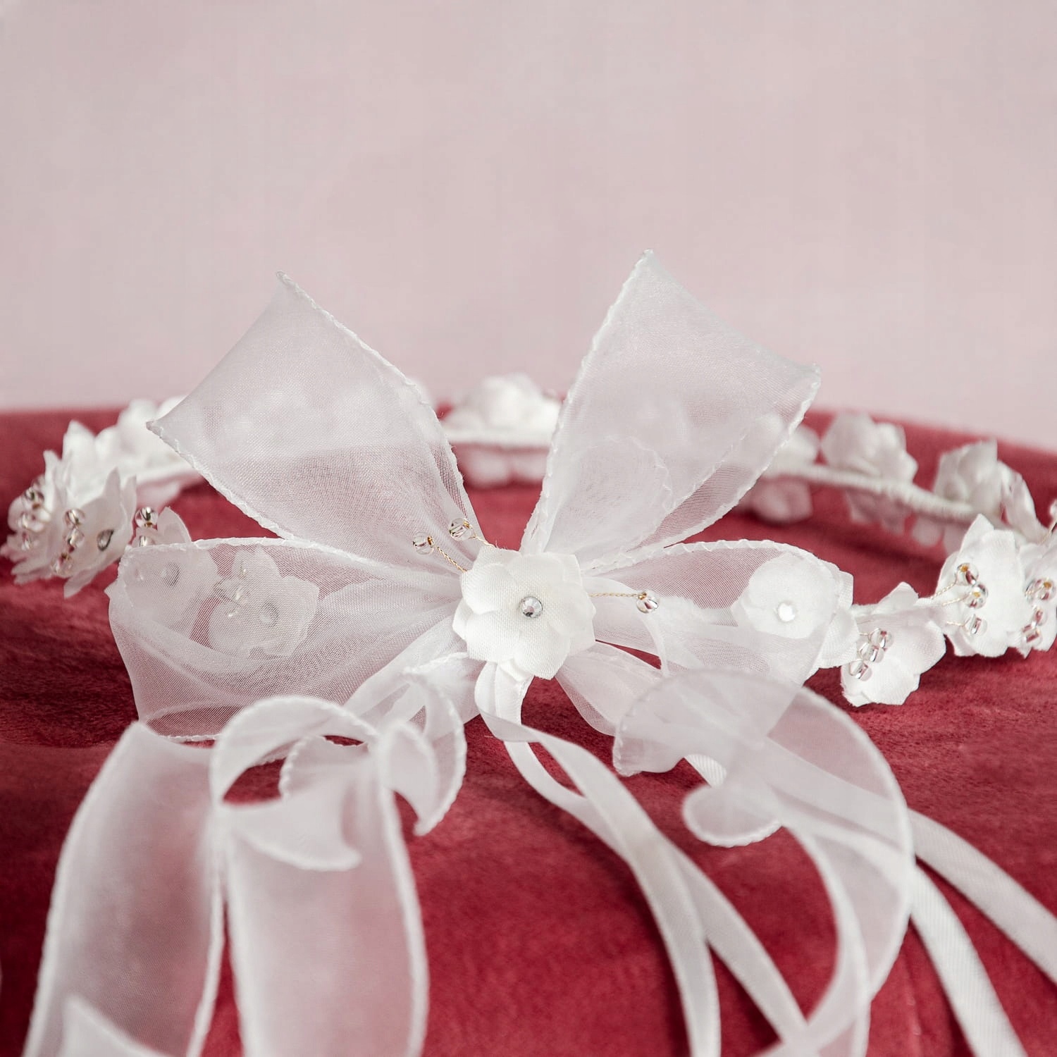Традиционный белый венок из тканевых цветов. Дополнительно украшен цирконами. Сзади полупрозрачный бант, украшенный цветком и стразами. От банта вниз спускаются три тюлевые и четыре тонкие атласные ленты. Красивый венок станет прекрасным дополнением в день Первого Причастия. Венок красиво смотрится как на распущенных, так и на завязанных волосах.