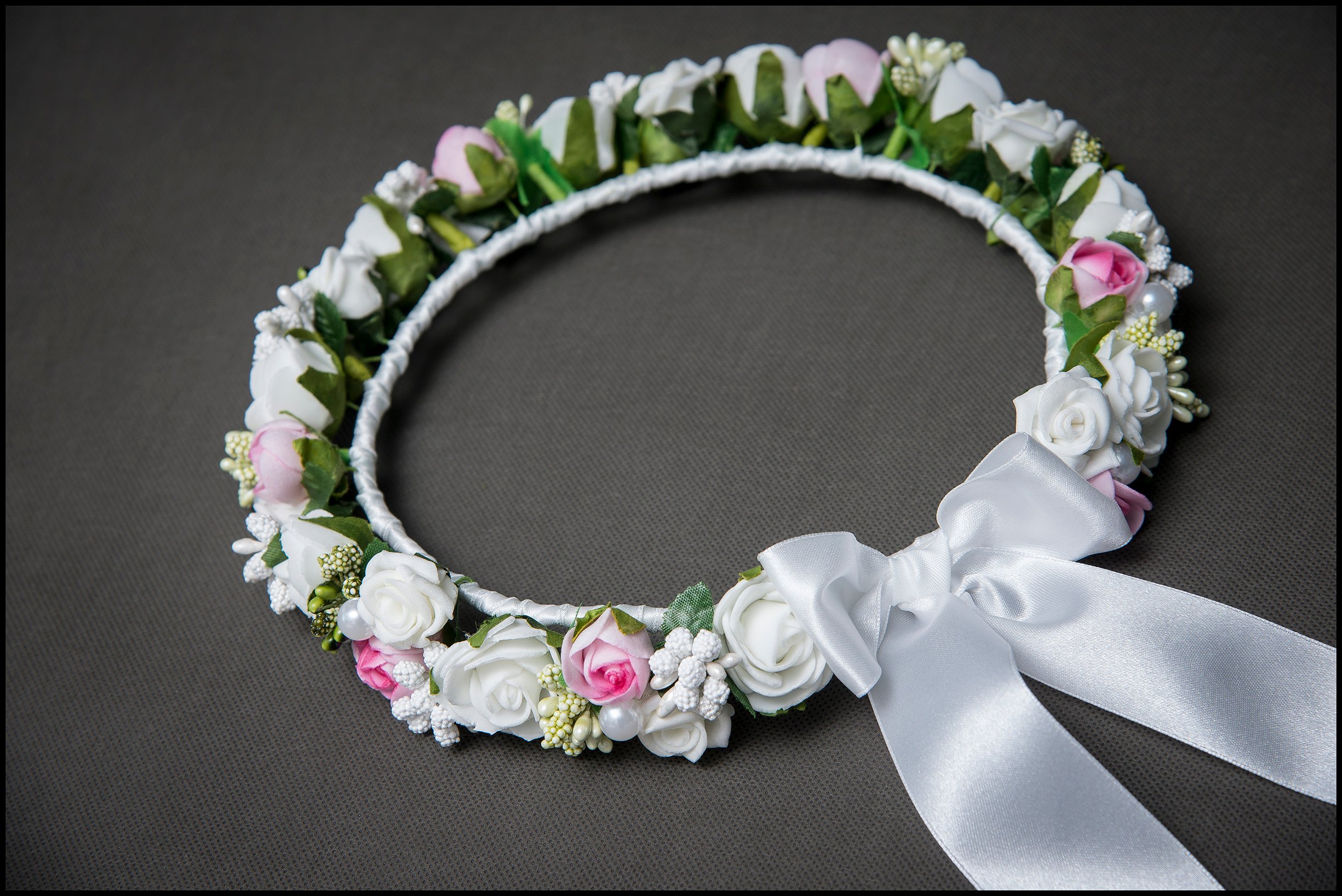 Реалистичный вид цветов, аксессуаров и отделка атласным бантом придают девушке нежный и элегантный вид в этот важный день.