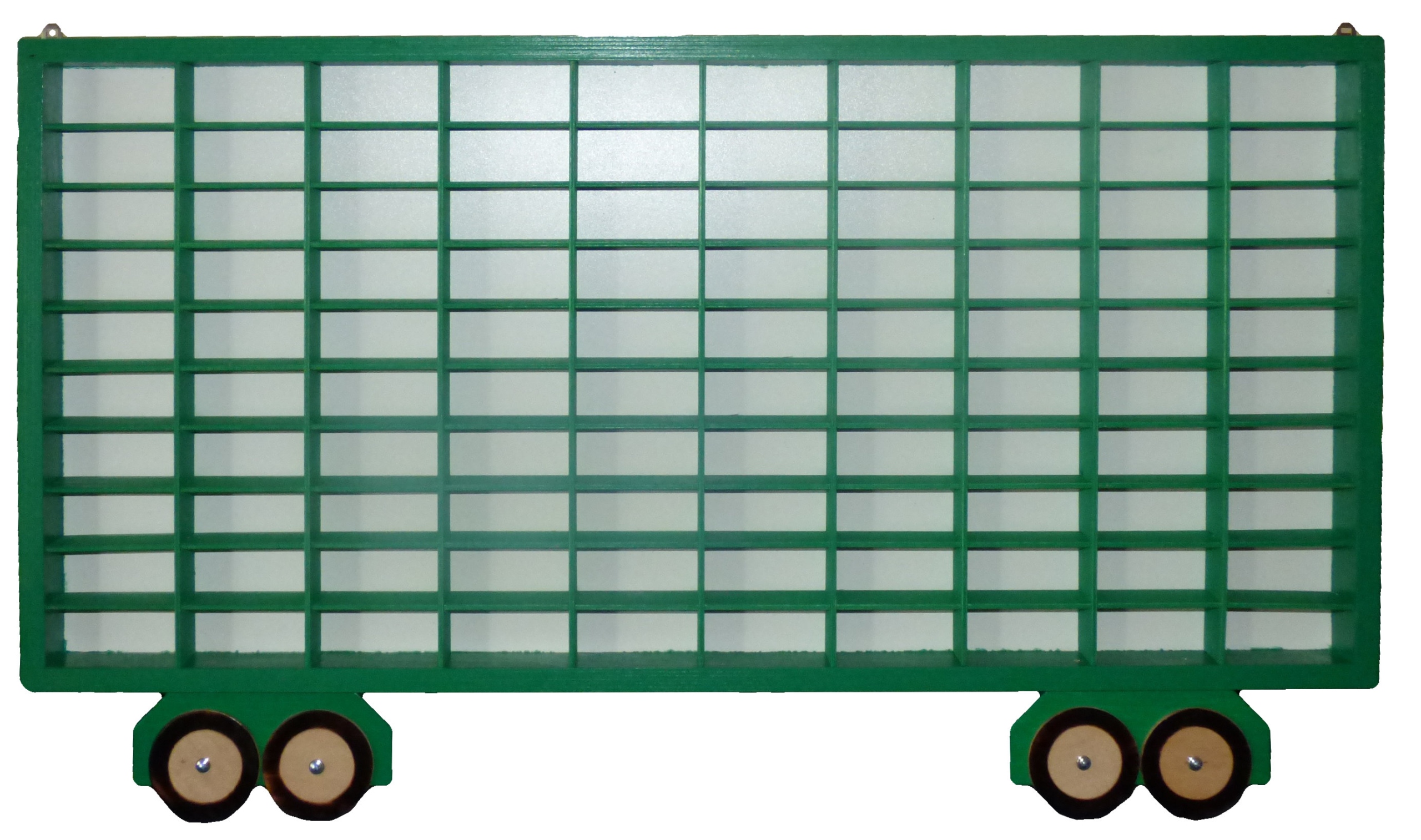Очень прочный - из фанеры 15 мм, решетка под машинки 4 мм. Кроме того, задняя часть укрепляет все и предотвращает дополнительное повреждение стены. Горизонтальные и вертикальные перегородки проклеены.