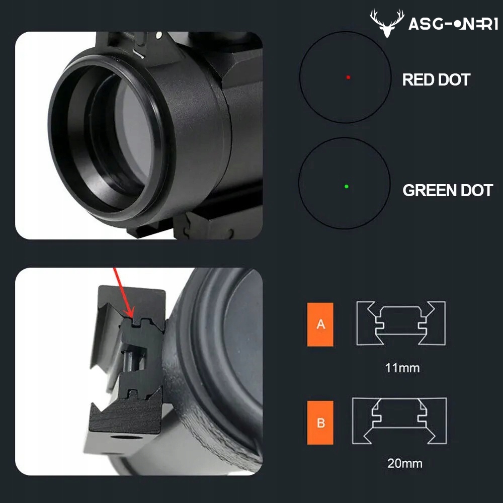 - Красные или зеленые точки с двойной подсветкой и 5-ступенчатой регулировкой яркости.