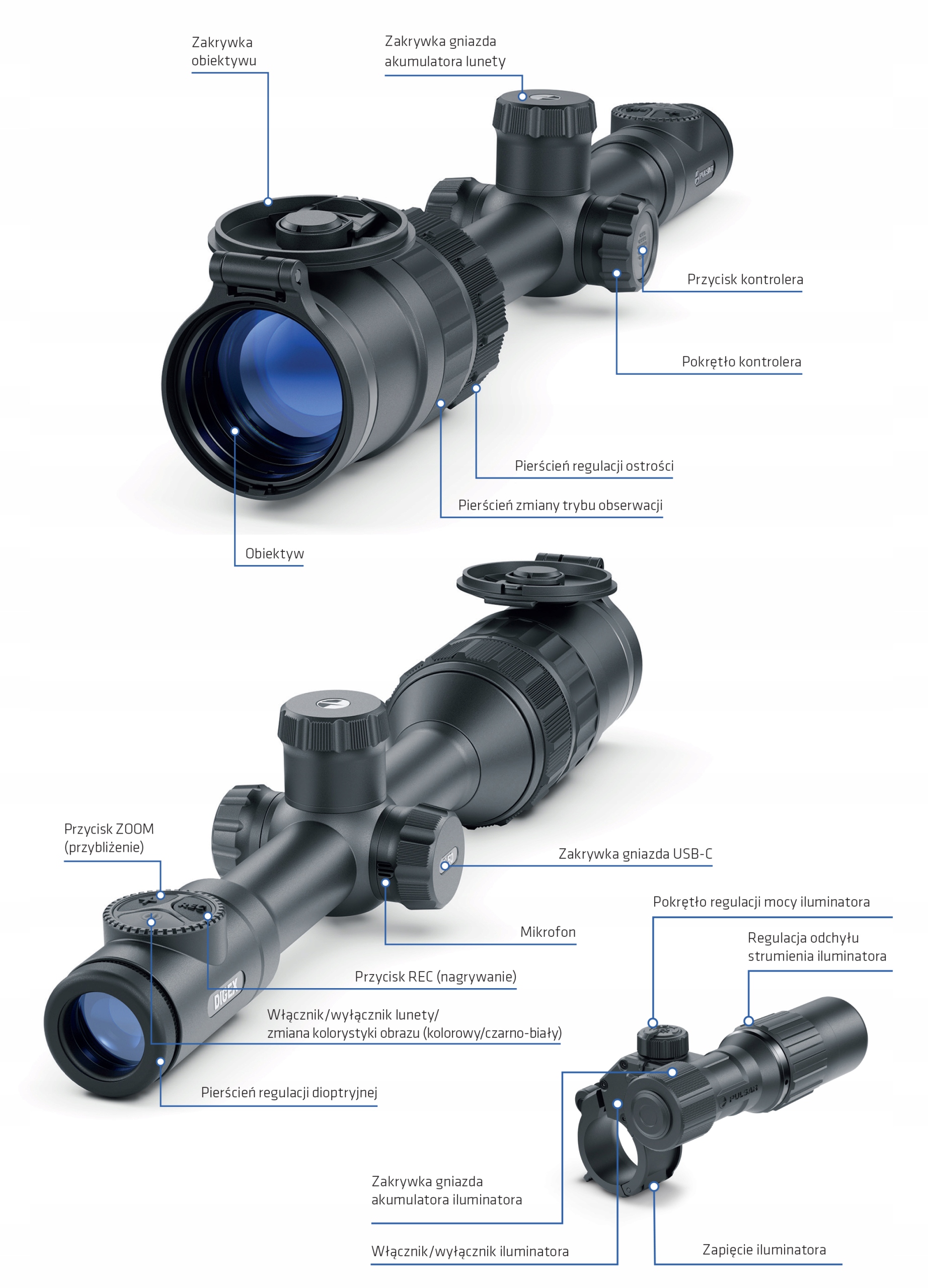 Прицел Digex C50 не оснащен инфракрасным осветителем, но мы можем легко оснастить его дополнительным инфракрасным осветителем серии XS с невидимой длиной волны 940 Нм или более мощной 850 Нм, что позволит нам вести наблюдение в полной темноте. до 500 метров.