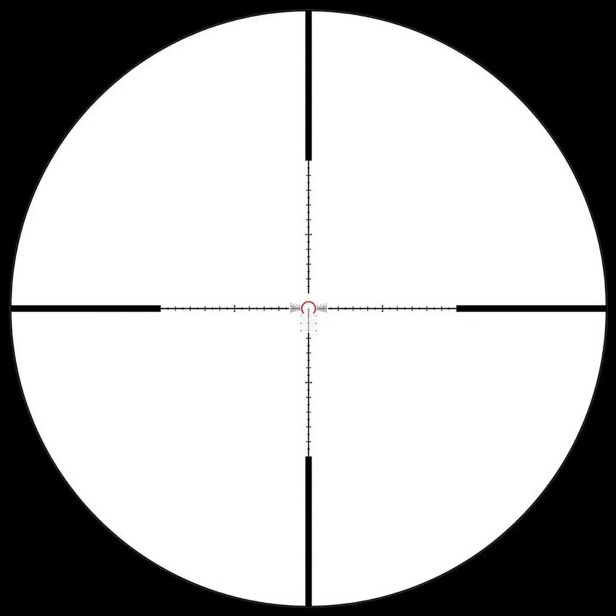 Телескоп оснащен крестом, расположенным на оптическом переднем плане, что является оптимальным выбором для его предполагаемого применения. Решение такого типа сохраняет реальные пропорции прицельной марки при изменении увеличения, что позволяет надежно оценить расстояние до цели. Причем в случае увеличений в нижней части диапазона крест остается небольшим, не отвлекая нас количеством деталей и позволяя быстро переключаться между целями. Рассматриваемая модель оснащена универсальной сеткой ACSS Griffin MIL M8, предназначенной для использования в прицелах LPVO. Прицельная сетка включает в себя центральный шеврон, окруженный контрастной красной подковой, что значительно улучшает быстрое обнаружение цели на близких дистанциях, а также шкалу в миллирадианах.